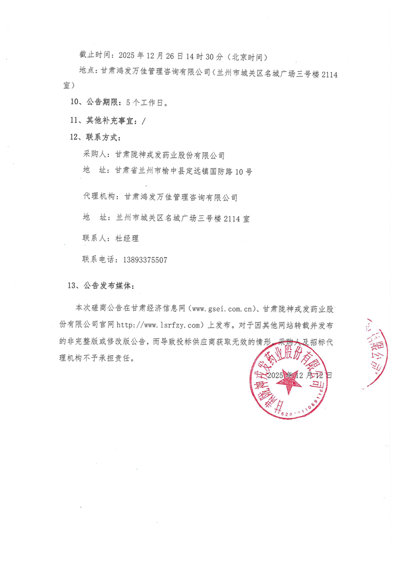 甘肅隴神戎發(fā)藥業(yè)股份有限公司2026年度聚乙二醇6000采購項目競爭性磋商公告
