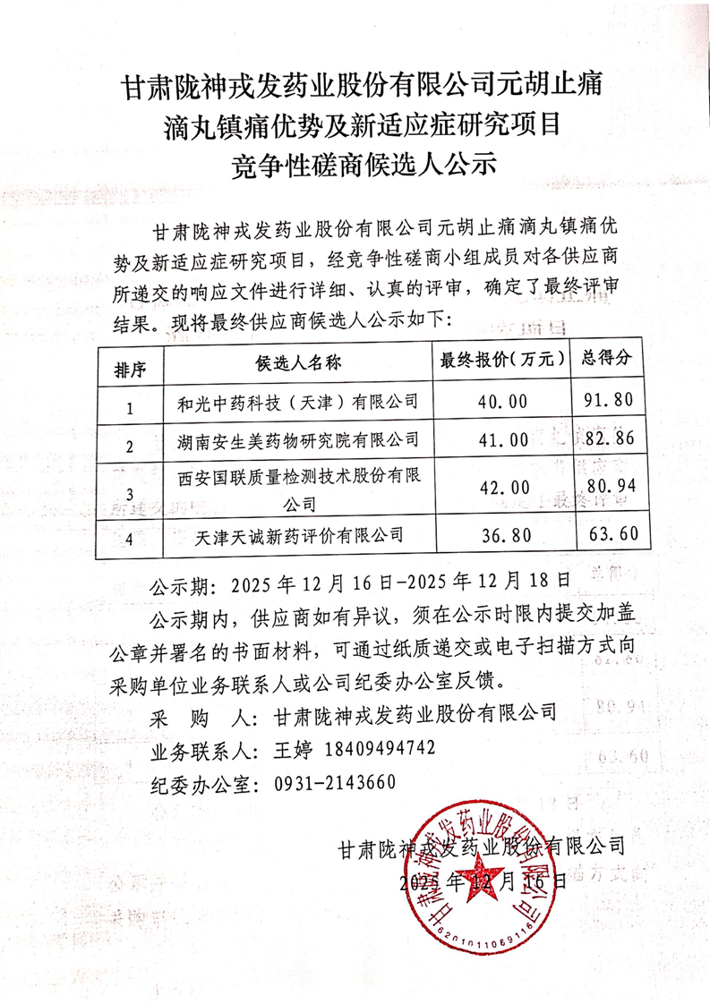 甘肅隴神戎發(fā)藥業(yè)股份有限公司元胡止痛滴丸鎮(zhèn)痛優(yōu)勢及新適應癥研究項目競爭性磋商候選人公示
