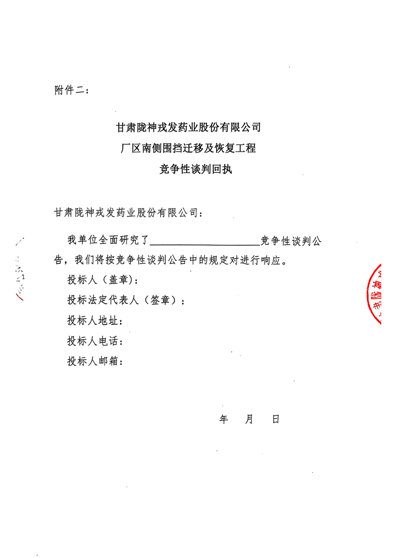 甘肅隴神戎發(fā)藥業(yè)股份有限公司廠區(qū)南側(cè)圍擋遷移及恢復(fù)工程競爭性談判公告
