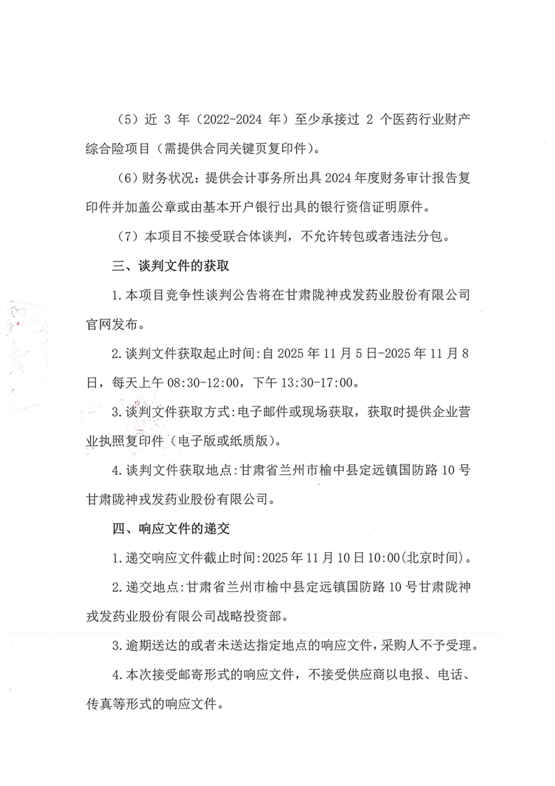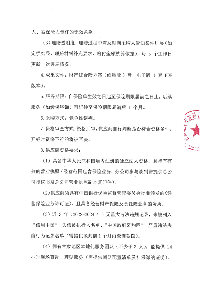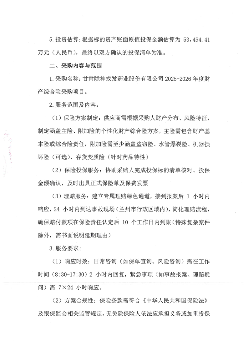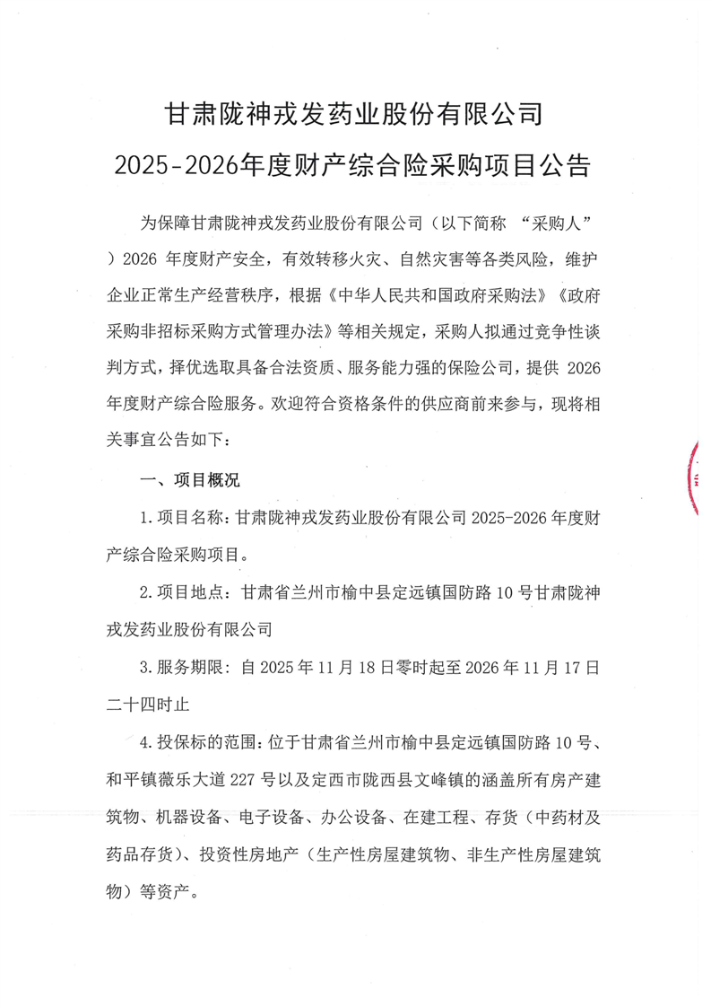 甘肅隴神戎發(fā)藥業(yè)股份有限公司2025-2026年度財產(chǎn)綜合險采購項目公告