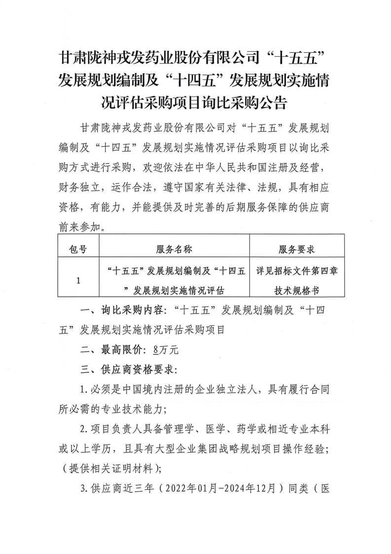 甘肅隴神戎發(fā)藥業(yè)股份有限公司“十五五”發(fā)展規(guī)劃編制及“十四五”發(fā)展規(guī)劃實(shí)施情況評(píng)估采購(gòu)項(xiàng)目詢(xún)比采購(gòu)公告