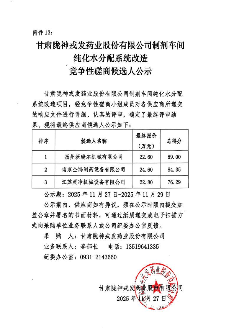 甘肅隴神戎發(fā)藥業(yè)股份有限公司制劑車(chē)間純化水分配系統(tǒng)改造競(jìng)爭(zhēng)性磋商候選人公示