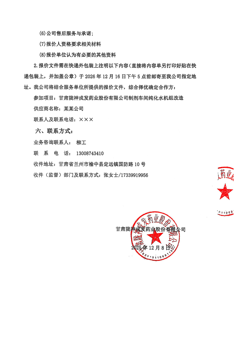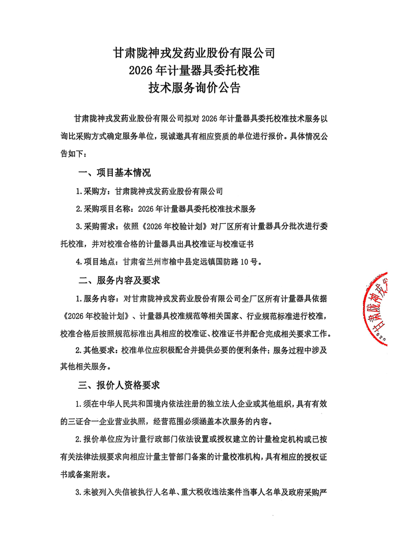 甘肅隴神戎發(fā)藥業(yè)股份有限公司2026年計(jì)量器具委托校準(zhǔn)技術(shù)服務(wù)詢價(jià)公告
