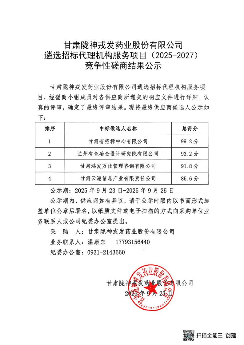甘肅隴神戎發(fā)藥業(yè)股份有限公司遴選招標(biāo)代理機構(gòu)服務(wù)項目(2025-2027)競爭性磋商結(jié)果公示