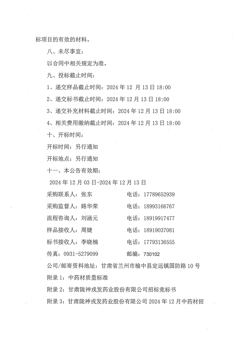 甘肅隴神戎發(fā)藥業(yè)股份有限公司2024年12月中藥材招標(biāo)采購公告