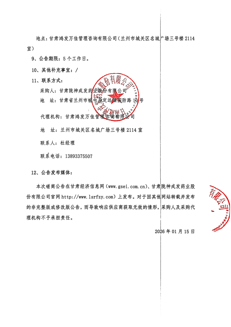 甘肅隴神戎發(fā)藥業(yè)股份有限公司2026年度聚乙二醇6000采購(gòu)項(xiàng)目(二次)競(jìng)爭(zhēng)性磋商公告