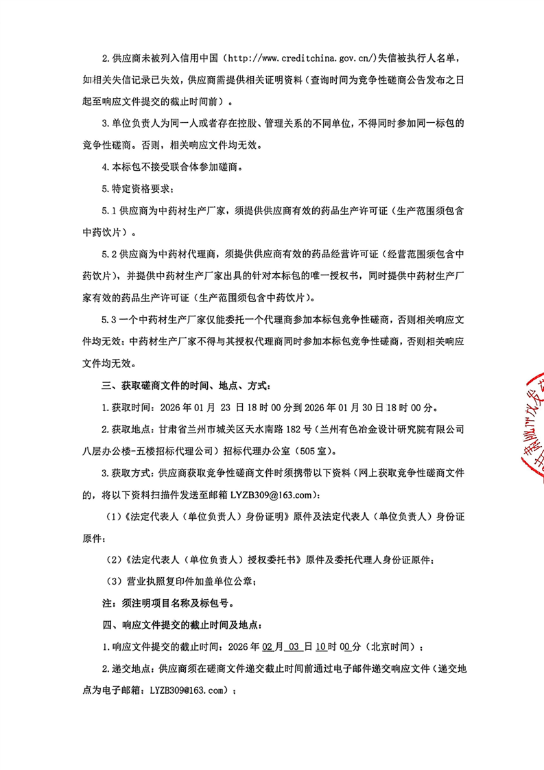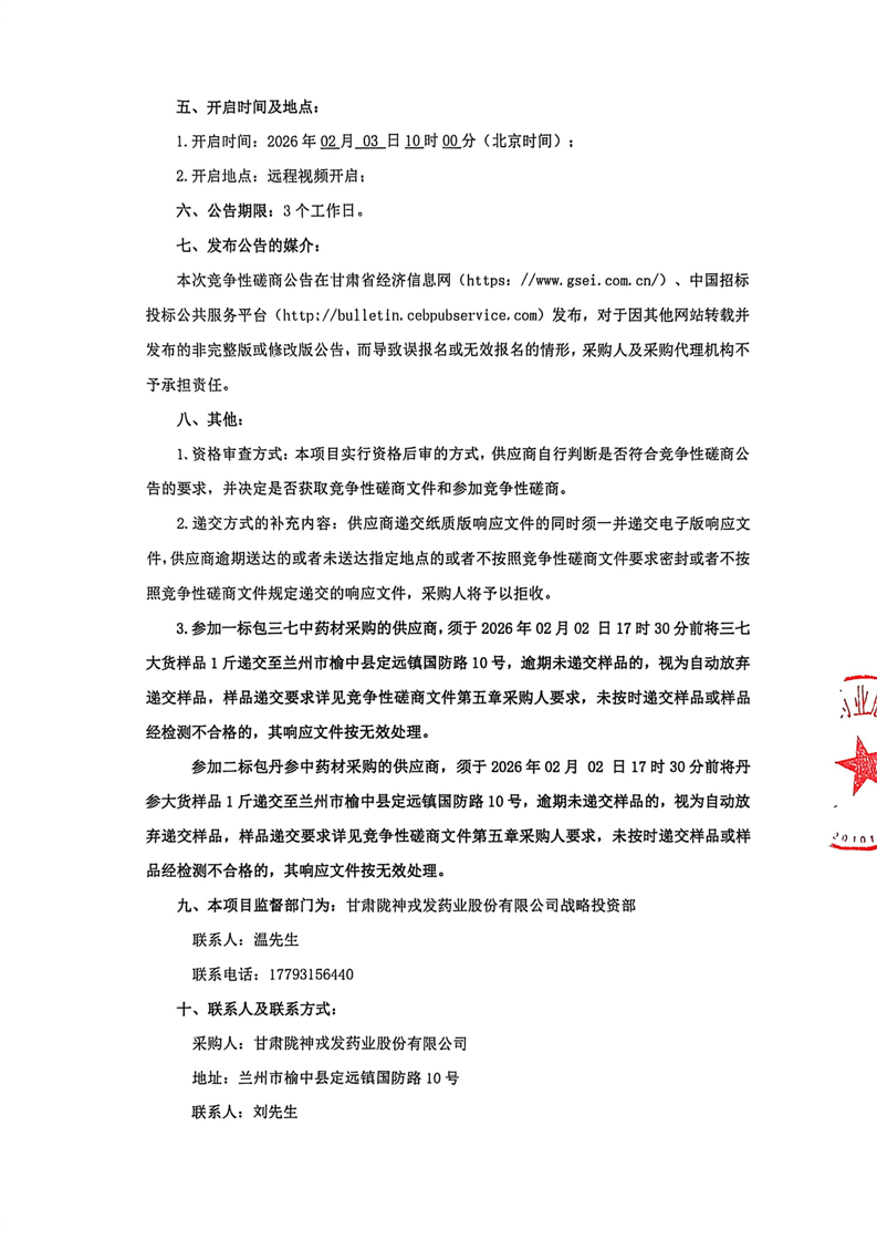 甘肅隴神戎發(fā)藥業(yè)股份有限公司2026年度三七、丹參中藥材采購項(xiàng)目(二次公告)競(jìng)爭(zhēng)性磋商公告