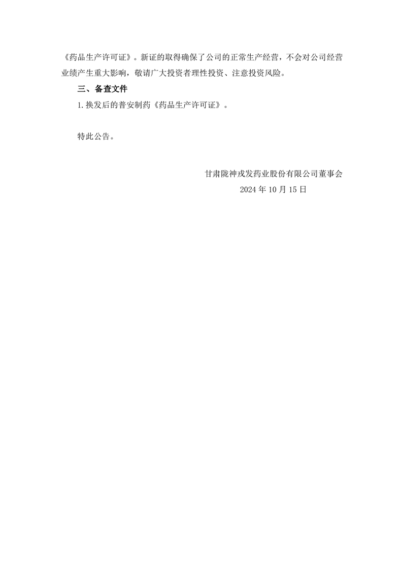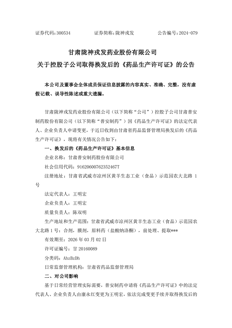 關(guān)于控股子公司取得換發(fā)后的《藥品生產(chǎn)許可證》的公告