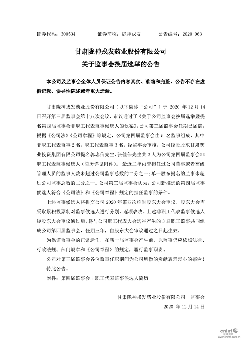 關(guān)于監(jiān)事會(huì)換屆選舉的公告