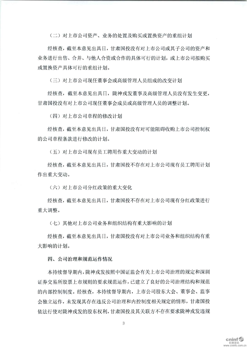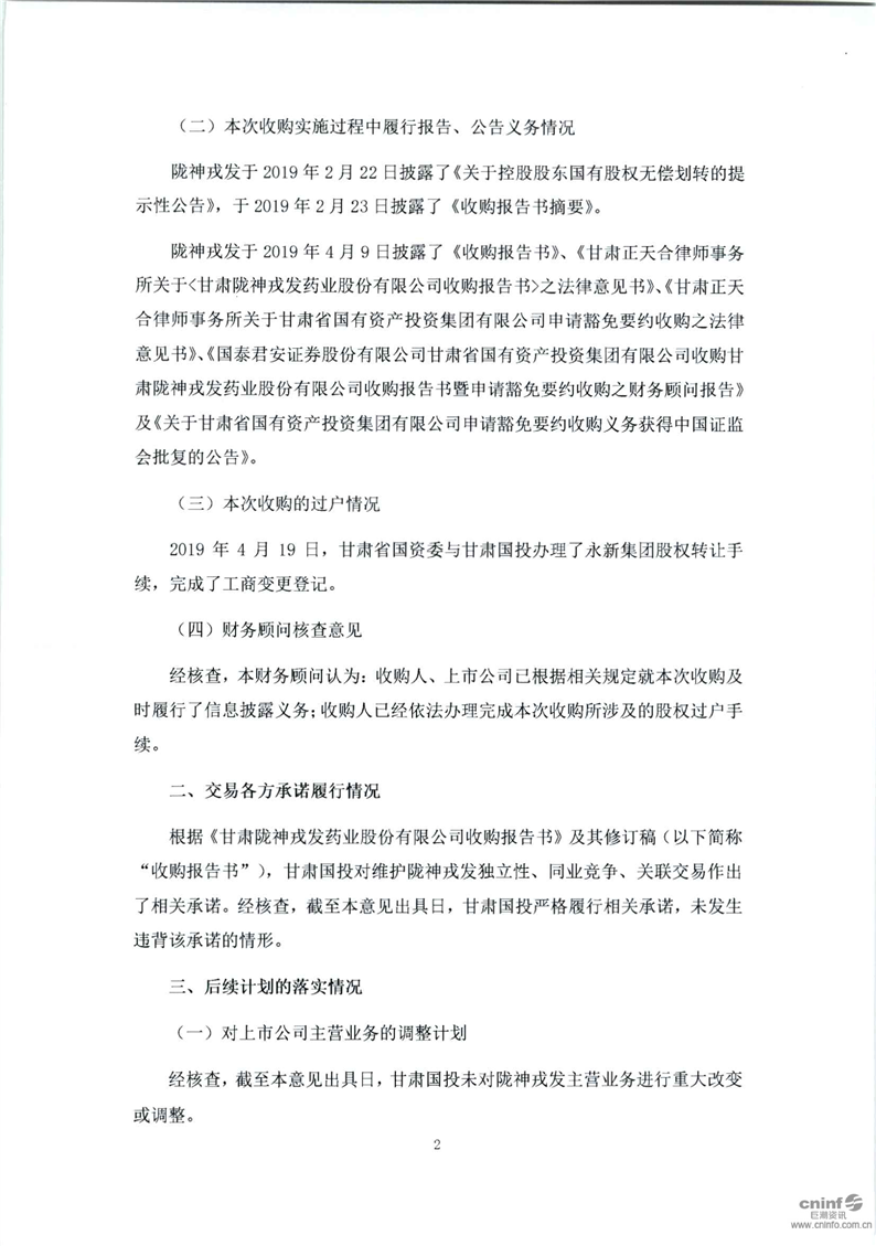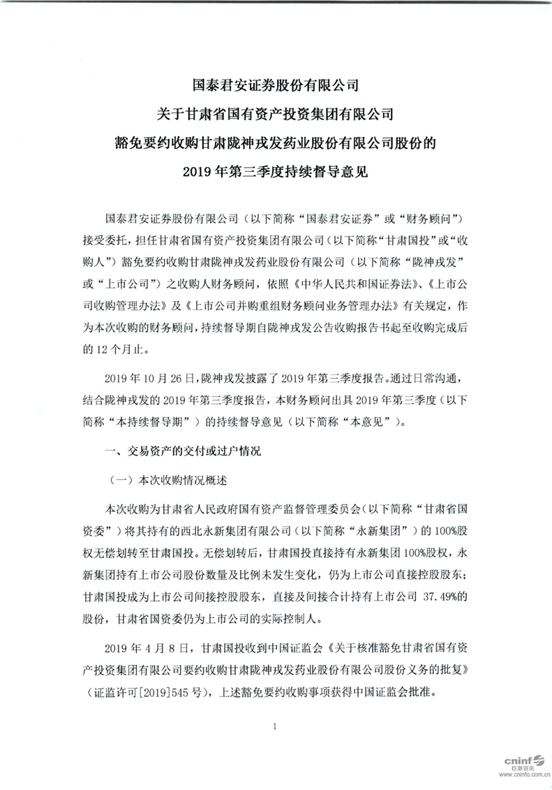 國泰君安證券股份有限公司關(guān)于甘肅省國有資產(chǎn)投資集團(tuán)有限公司豁免要約收購公司股份的2019年第三季度持續(xù)督導(dǎo)意見