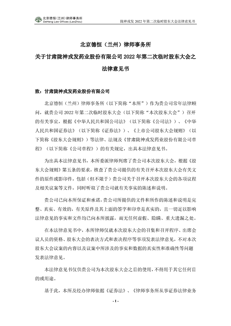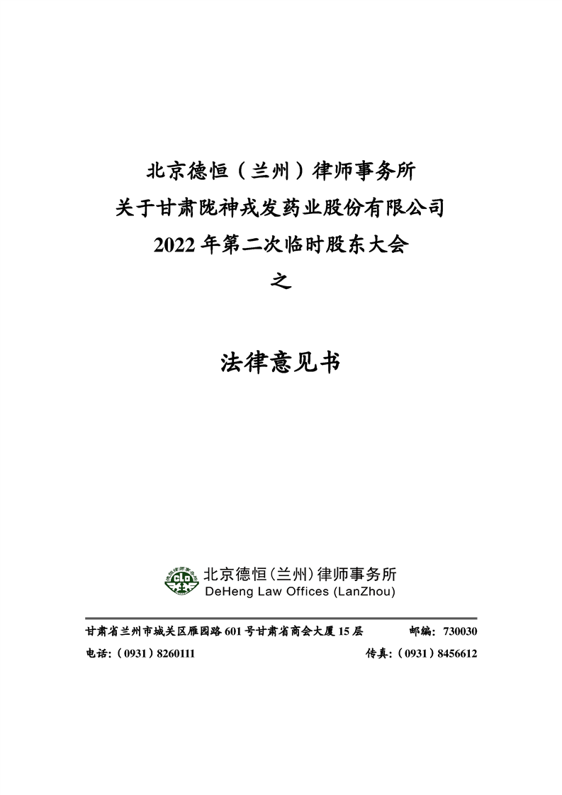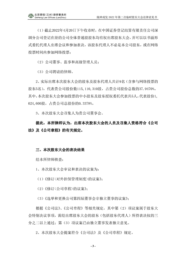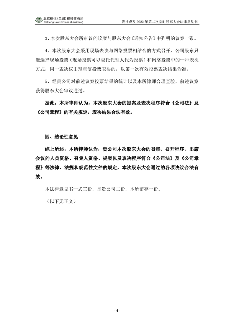 隴神戎發(fā)2022年第二次臨時(shí)股東大會(huì)法律意見書
