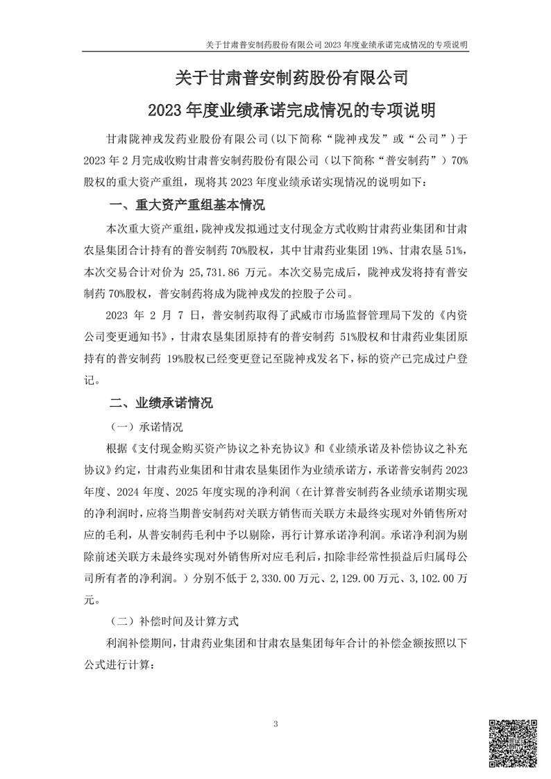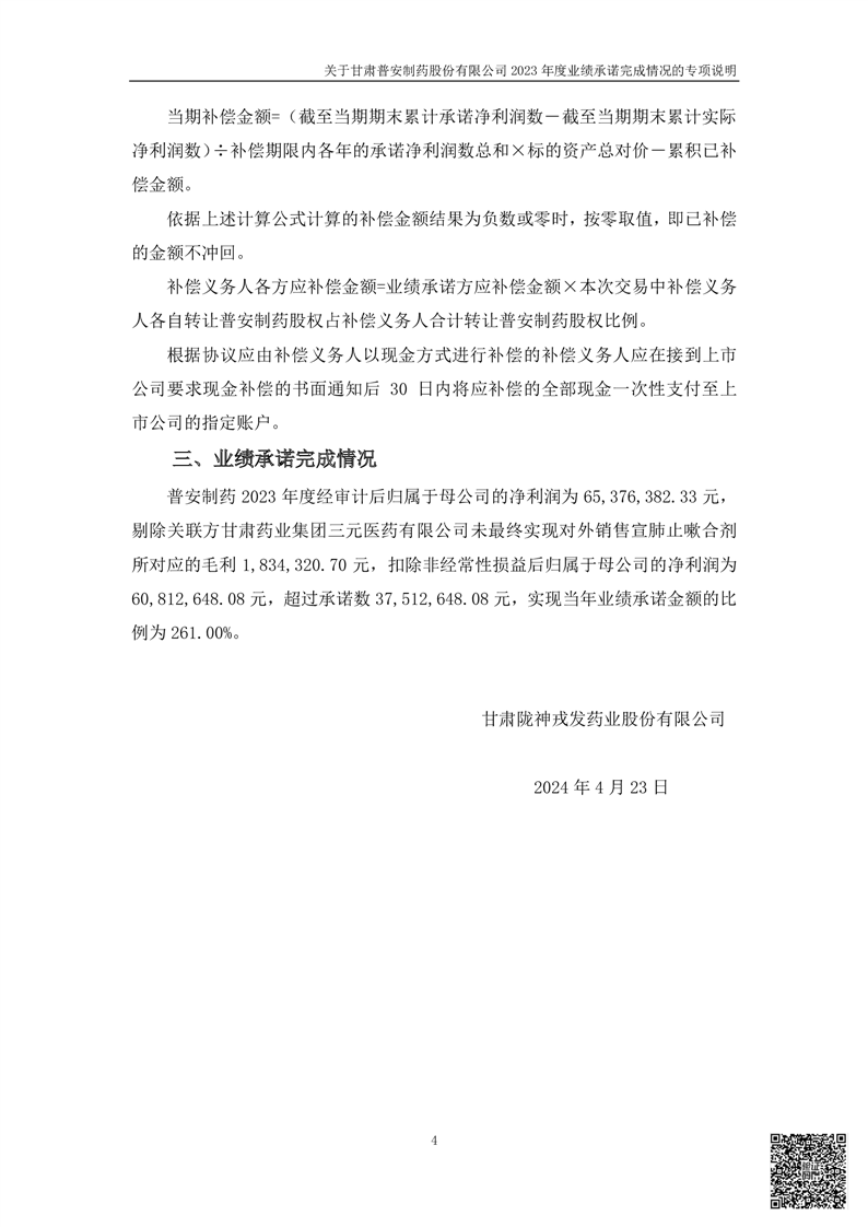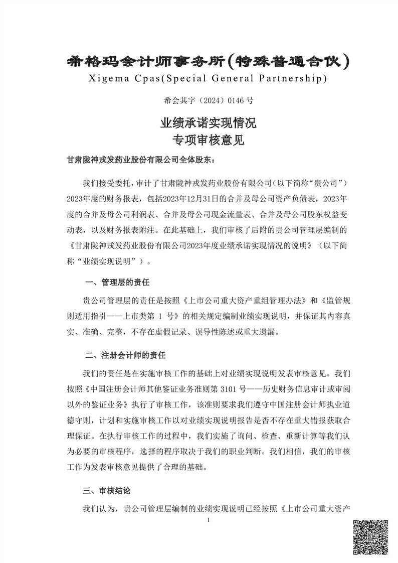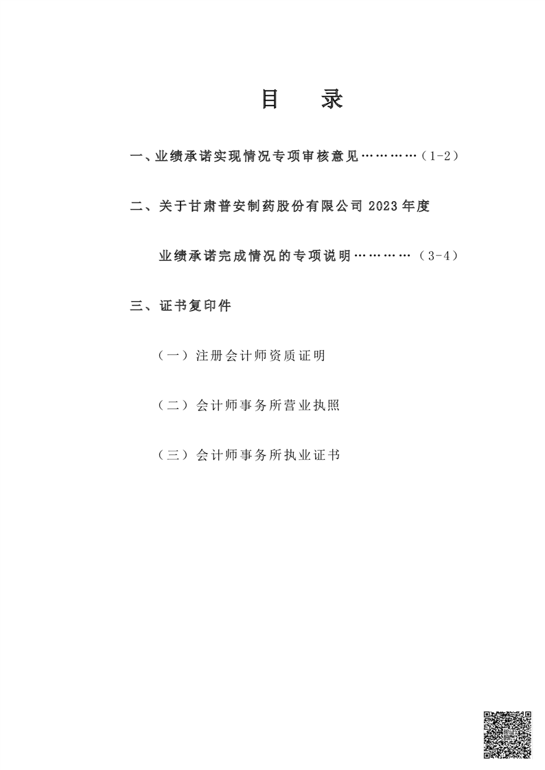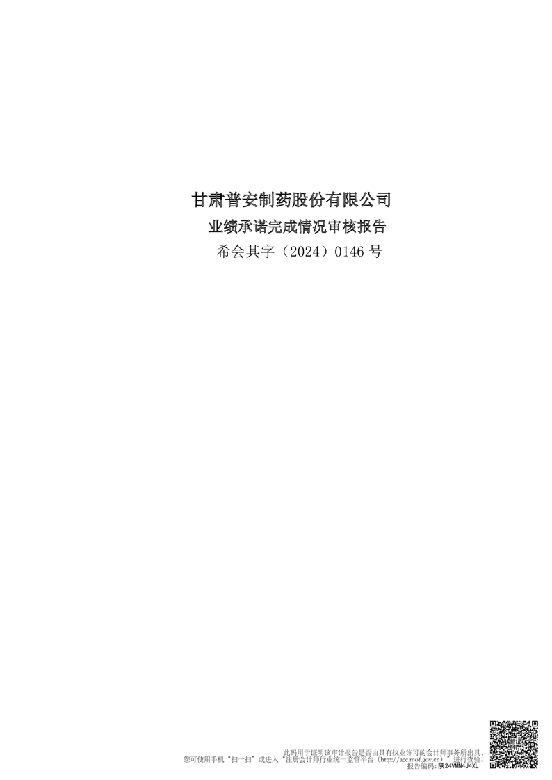 甘肅普安制藥股份有限公司業(yè)績(jī)承諾完成情況審核報(bào)告(更正后)