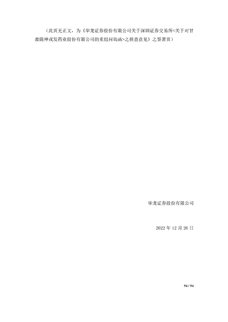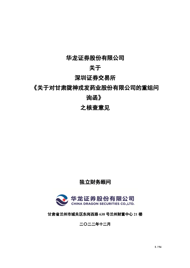 華龍證券股份有限公司關(guān)于深圳證券交易所《關(guān)于對甘肅隴神戎發(fā)藥業(yè)股份有限公司的重組問詢函》之核查意見