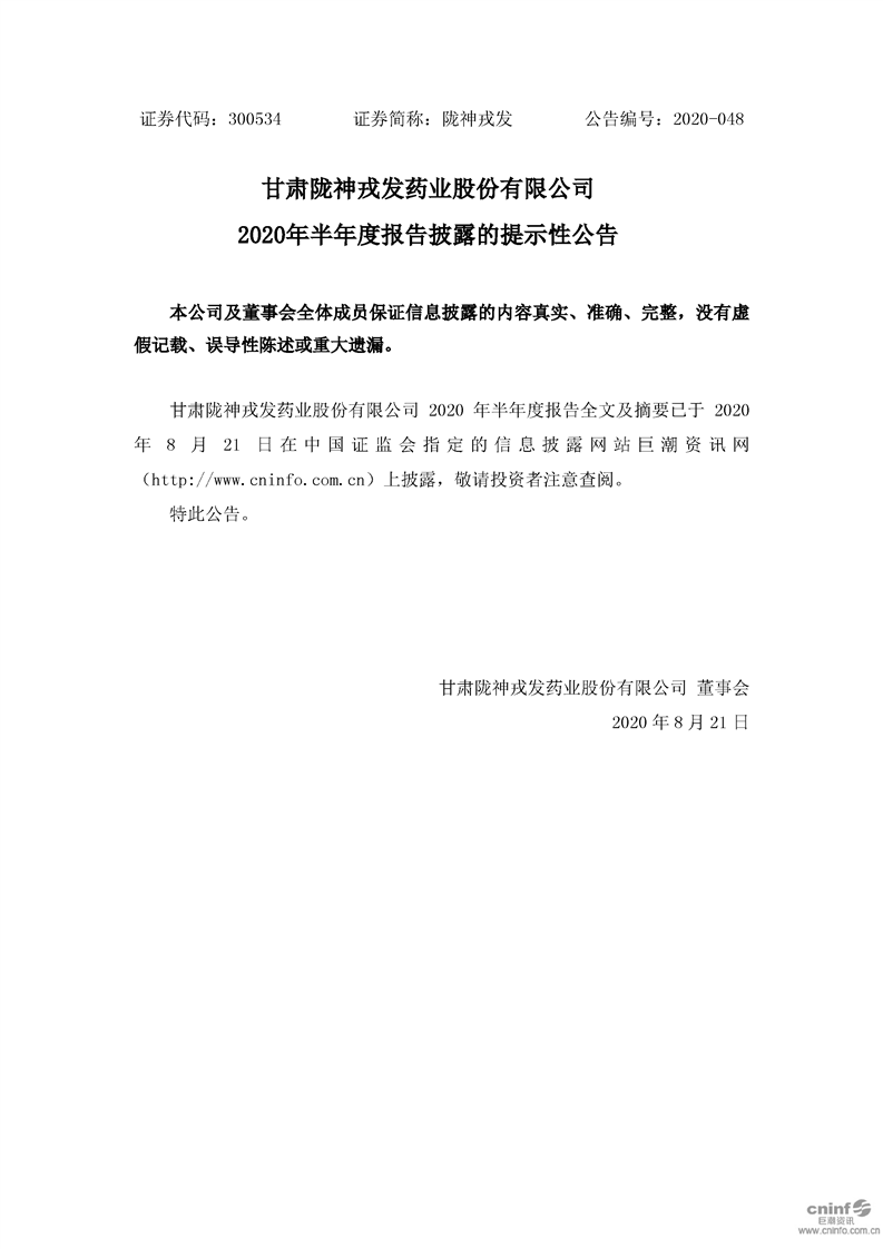 2020年半年度報告披露的提示性公告