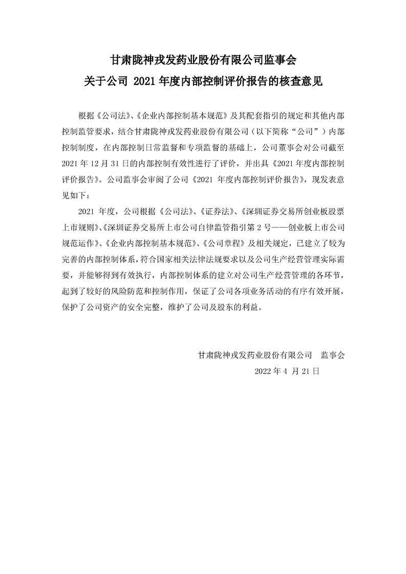 監(jiān)事會關(guān)于公司2021年度內(nèi)部控制評價報告的核查意見