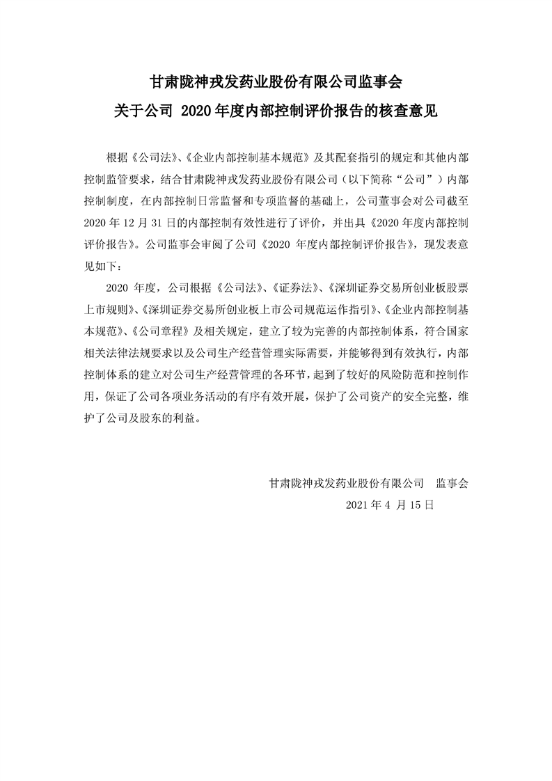 監(jiān)事會關(guān)于公司2020年度內(nèi)部控制評價報告的核查意見