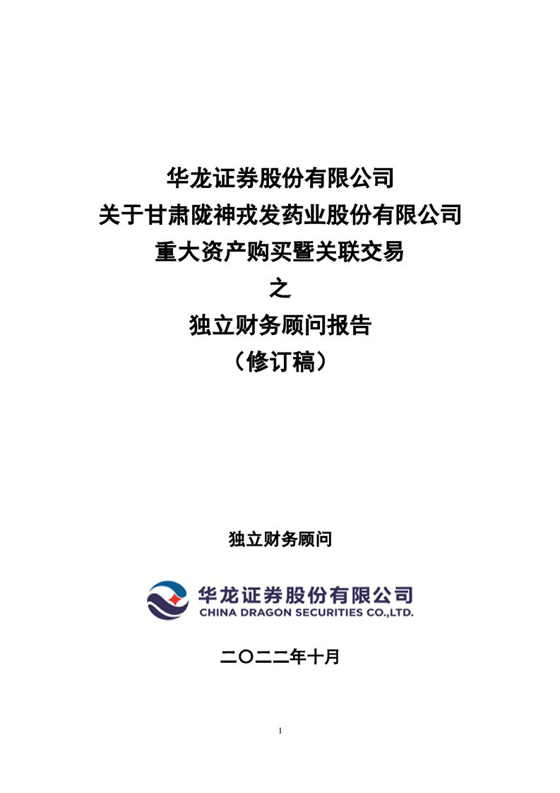 華龍證券股份有限公司關(guān)于甘肅隴神戎發(fā)藥業(yè)股份有限公司重大資產(chǎn)購買暨關(guān)聯(lián)交易之獨(dú)立財(cái)務(wù)顧問報(bào)告(修訂稿)