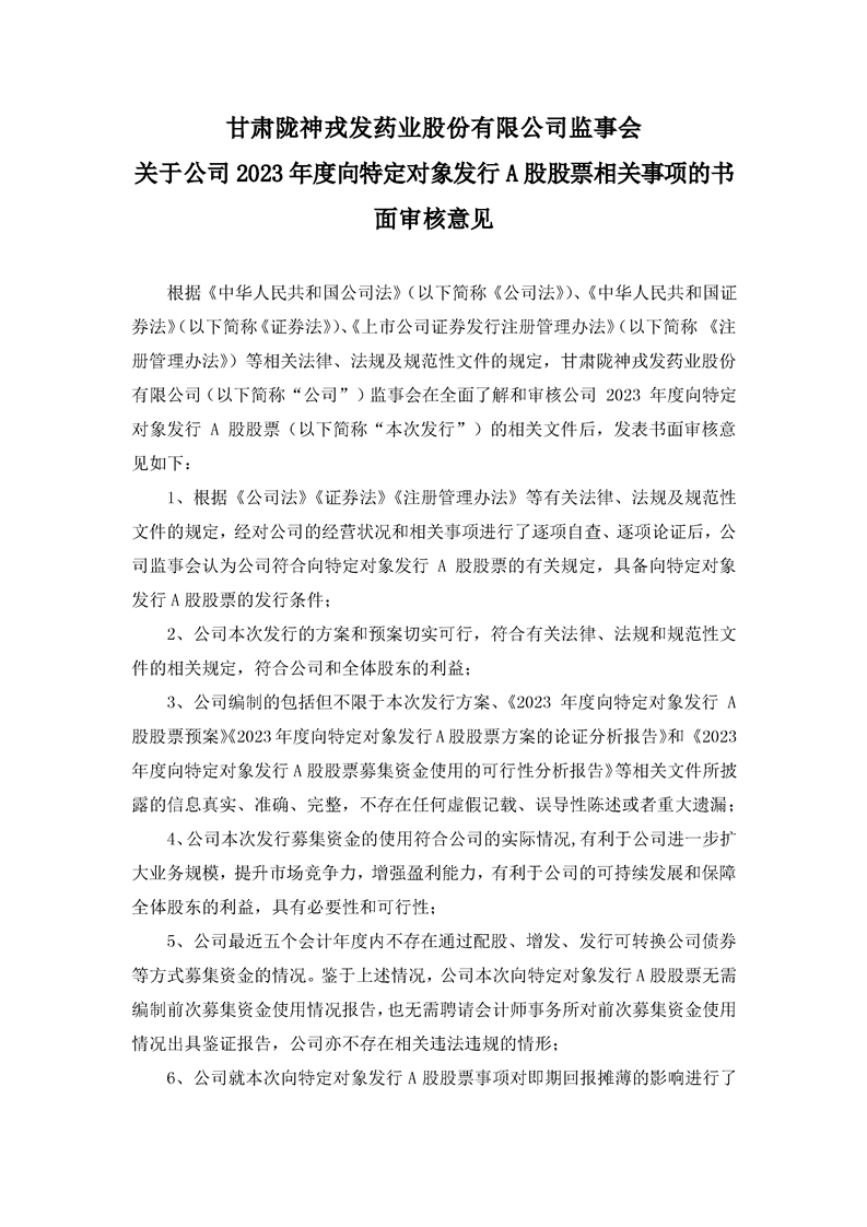 監(jiān)事會關(guān)于公司2023年度向特定對象發(fā)行A股股票相關(guān)事項(xiàng)的書面審核意見