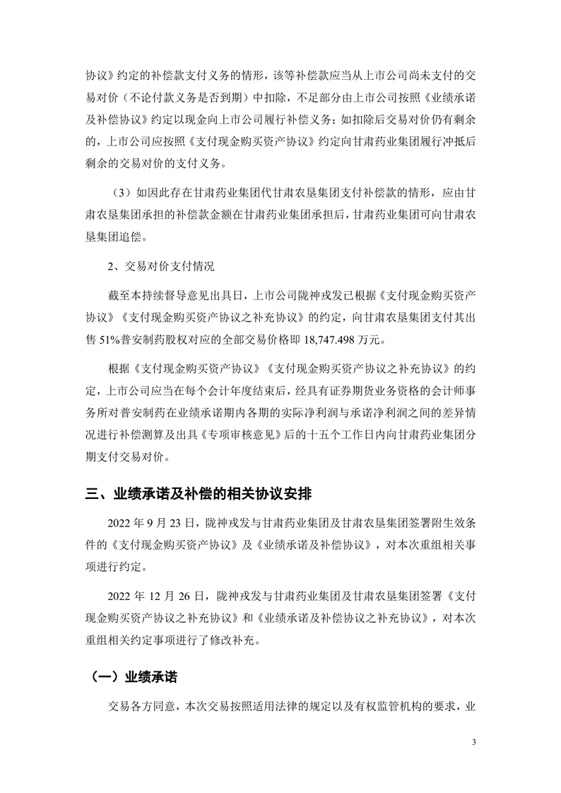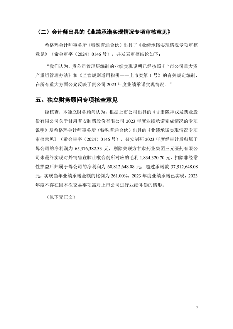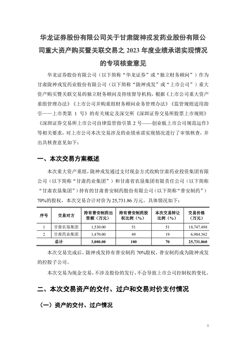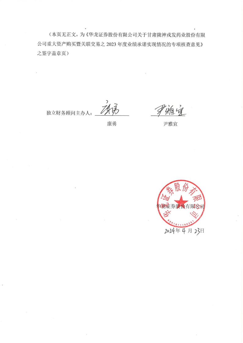 華龍證券股份有限公司關(guān)于甘肅隴神戎發(fā)藥業(yè)股份有限公司重大資產(chǎn)購買暨關(guān)聯(lián)交易之2023年度業(yè)績承諾實現(xiàn)情況的專項核查意見