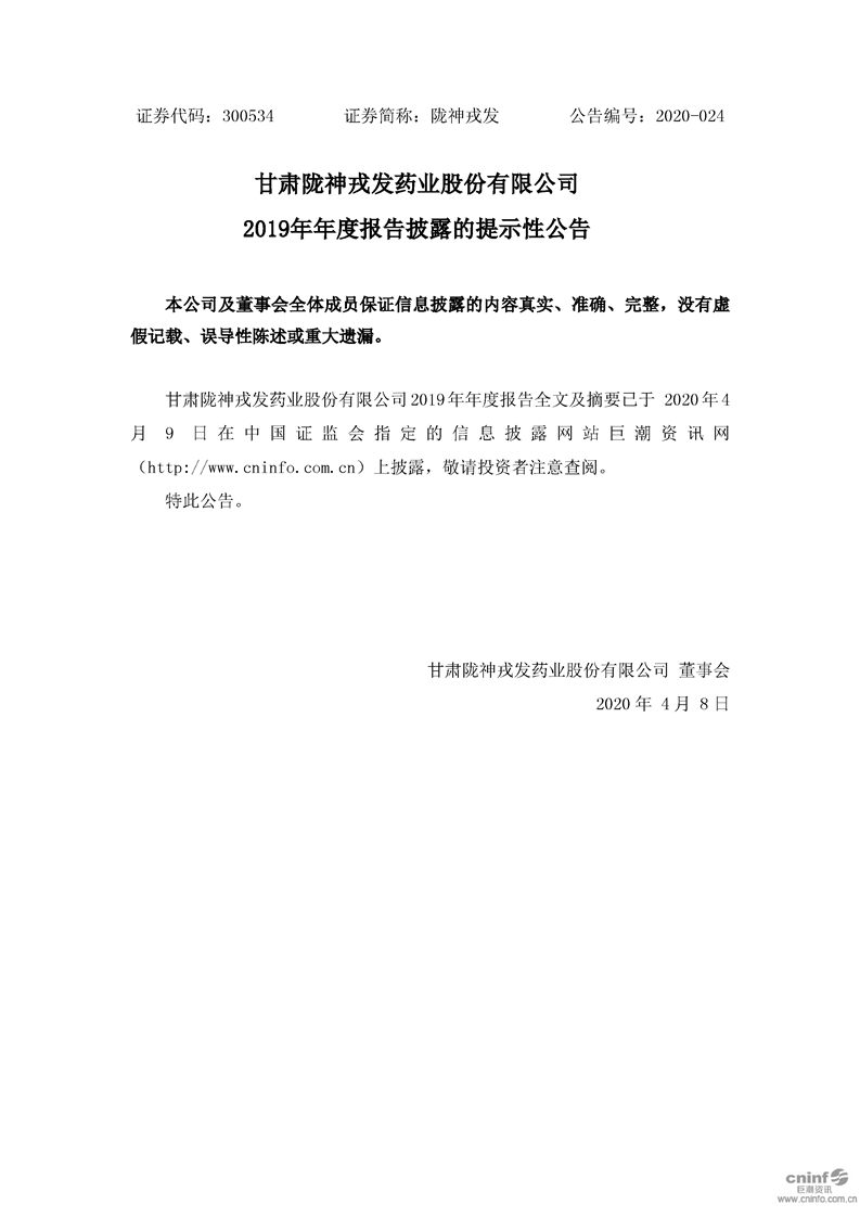 2019年年度報告披露的提示性公告