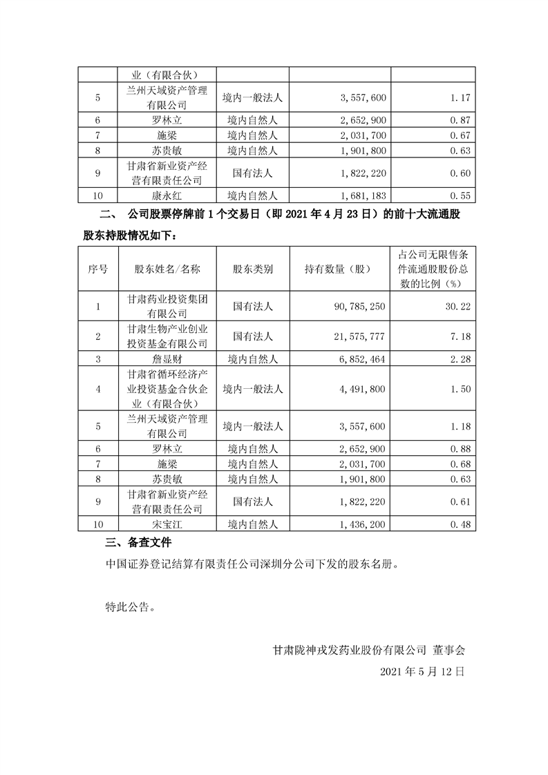關(guān)于本次交易停牌前一交易日前十大股東和前十大流通股東持股情況的公告