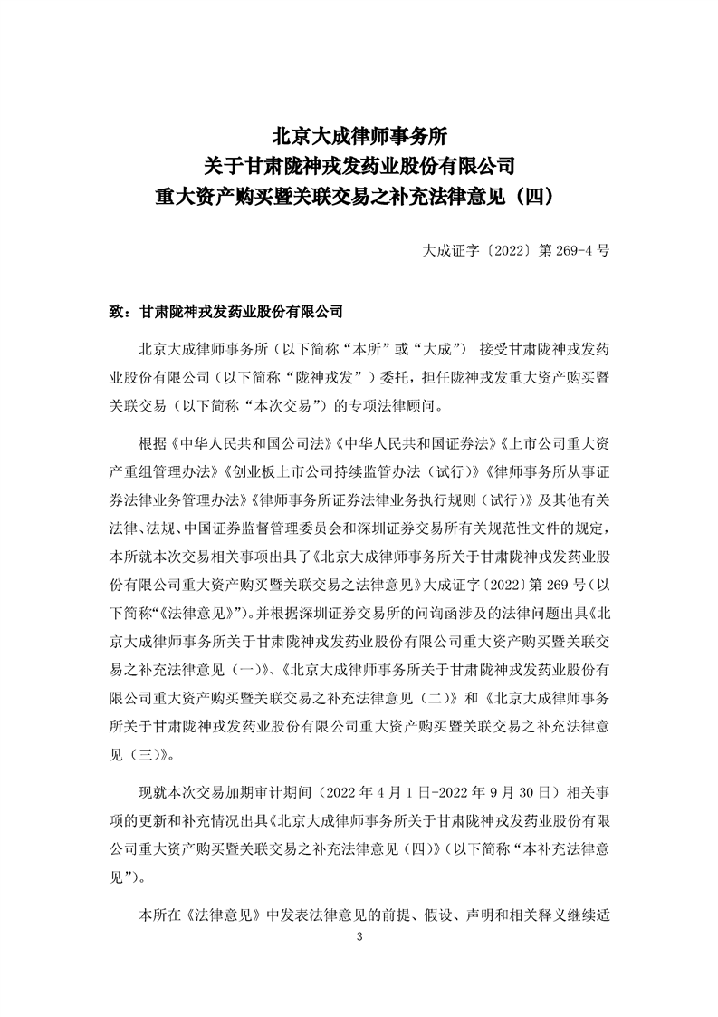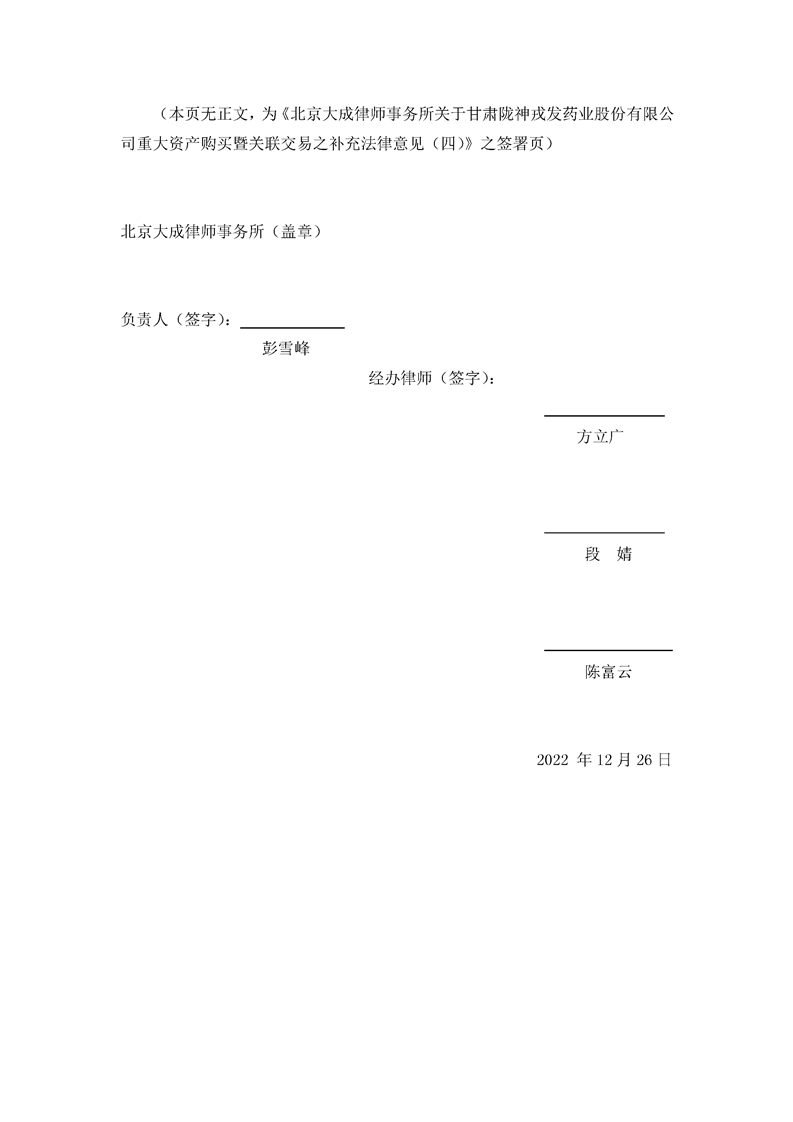 北京大成律師事務(wù)所關(guān)于甘肅隴神戎發(fā)藥業(yè)股份有限公司重大資產(chǎn)購買暨關(guān)聯(lián)交易補(bǔ)充法律意見(四)