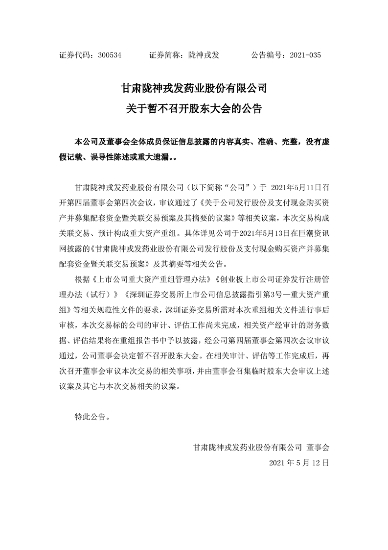 關于暫不召開股東大會的公告