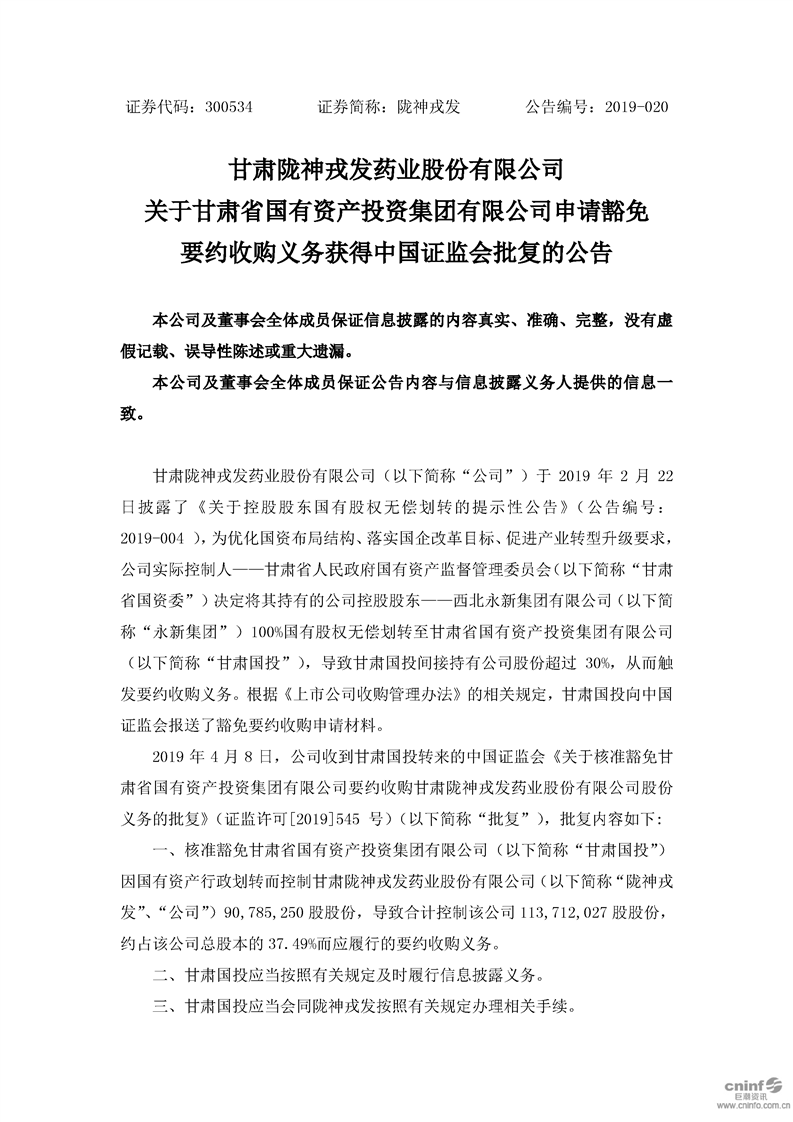 關(guān)于甘肅省國有資產(chǎn)投資集團有限公司申請豁免要約收購義務(wù)獲得中國證監(jiān)會批復(fù)的公告