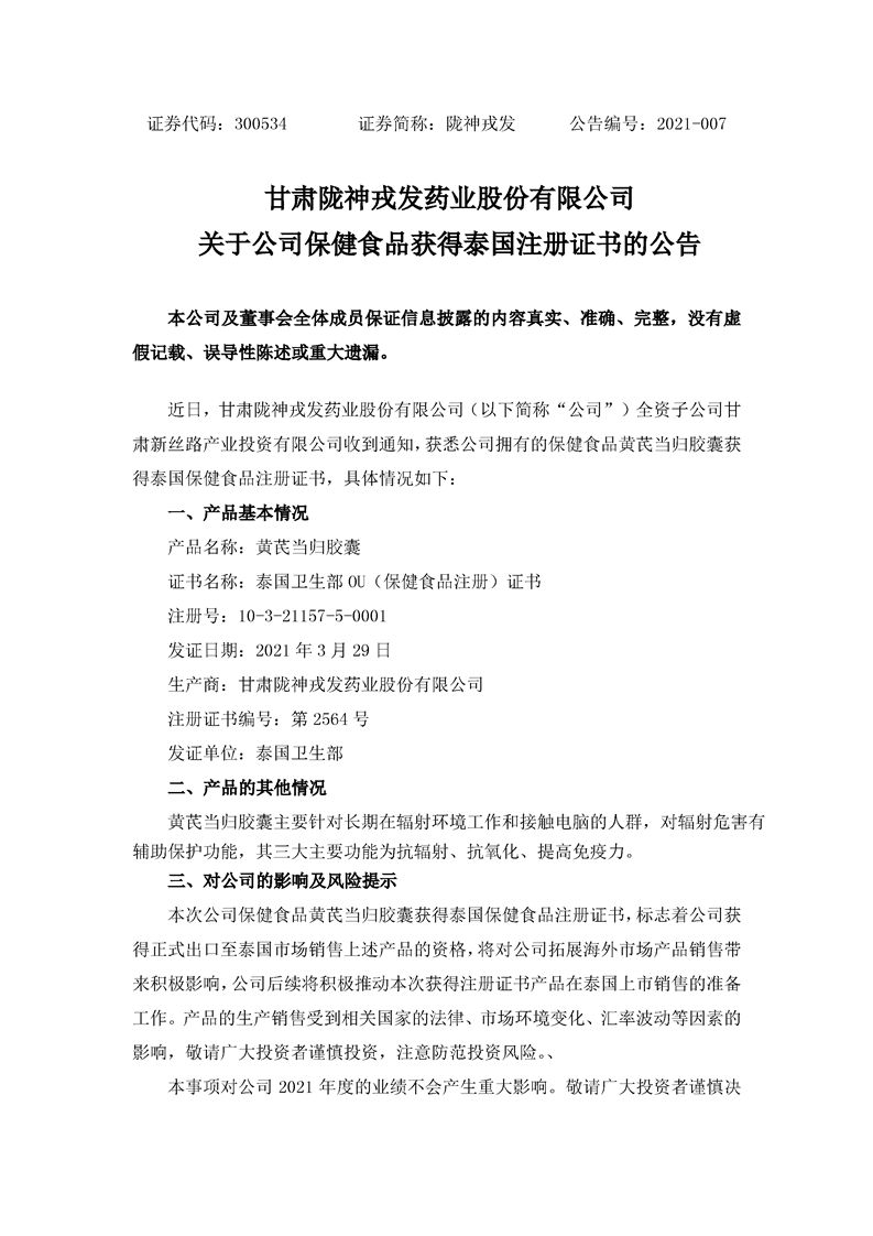 關(guān)于公司保健食品獲得泰國(guó)注冊(cè)證書的公告