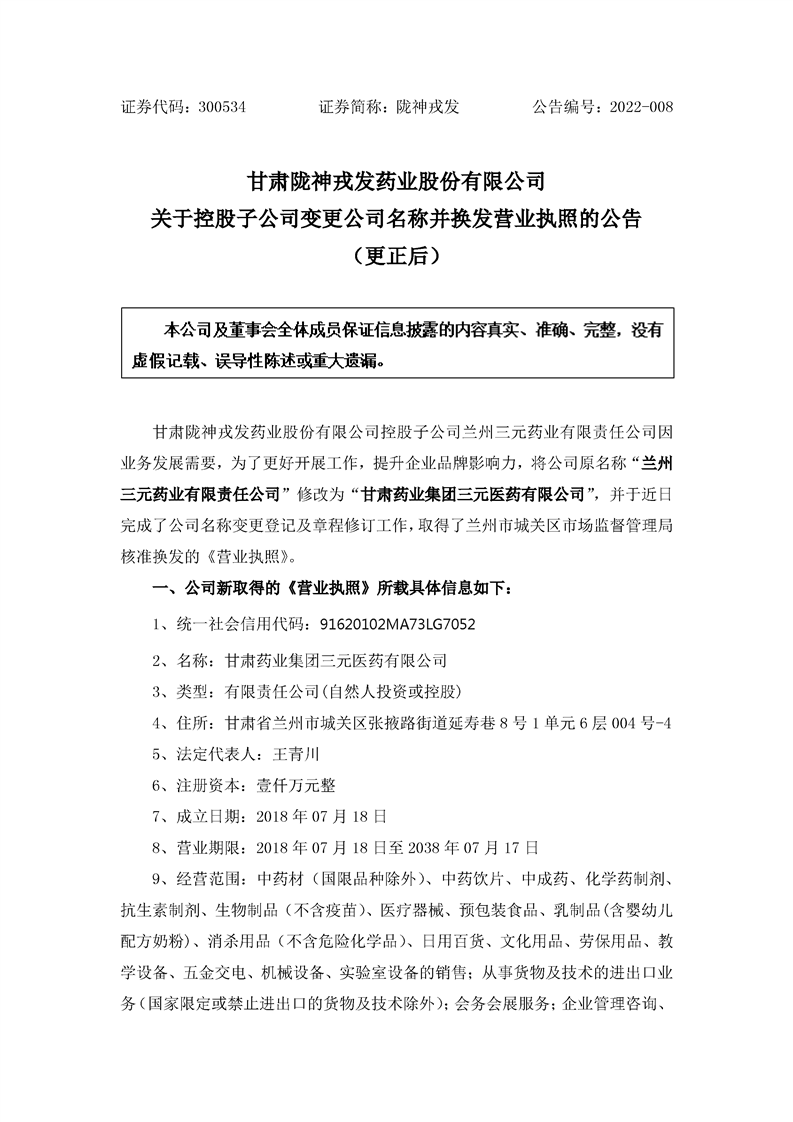 關(guān)于控股子公司變更公司名稱并換發(fā)營業(yè)執(zhí)照的公告(更正后)