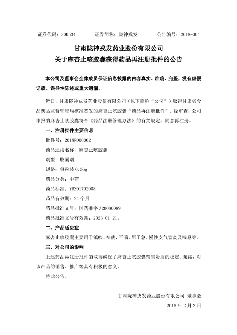 關(guān)于麻杏止咳膠囊獲得藥品再注冊批件的公告