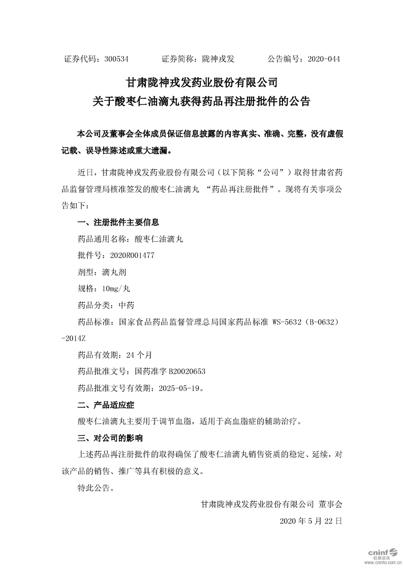 關(guān)于酸棗仁油滴丸獲得藥品再注冊(cè)批件的公告