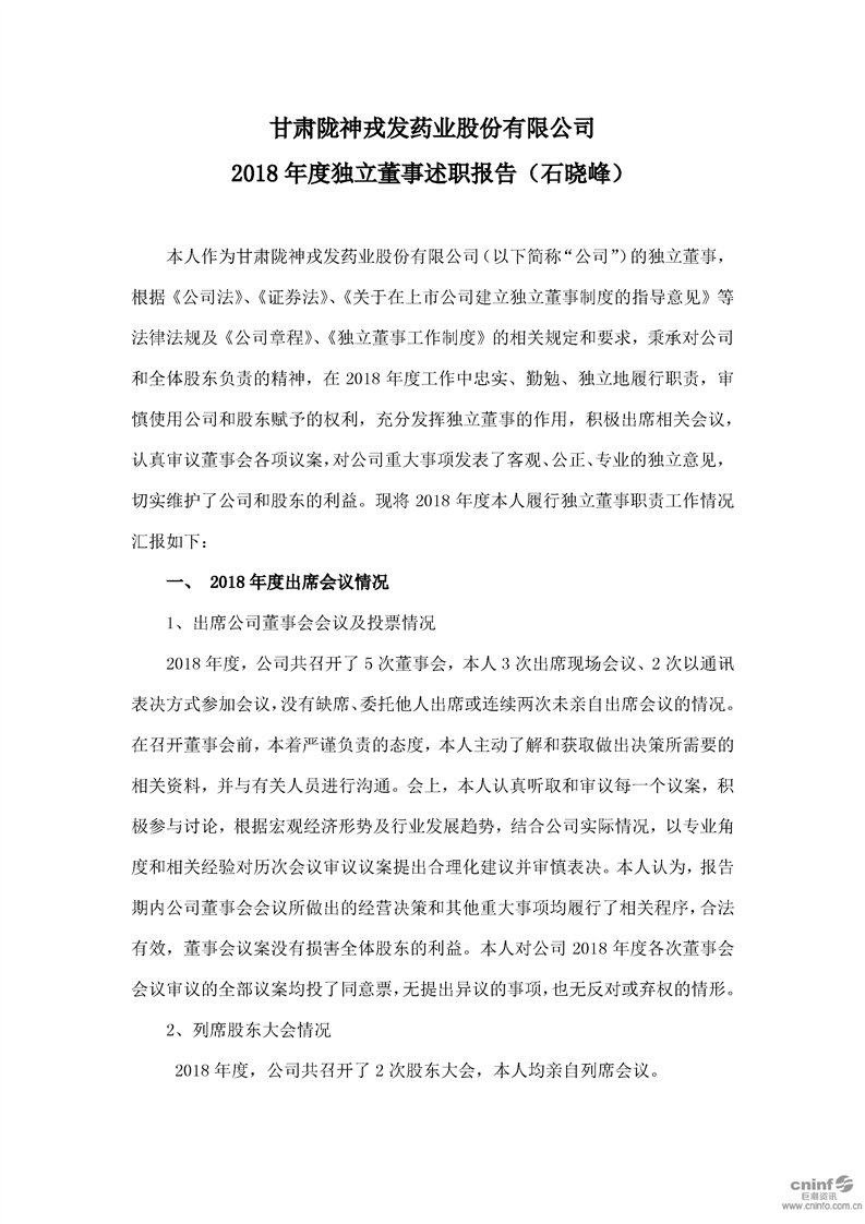 2018 年度獨(dú)立董事述職報(bào)告(石曉峰)
