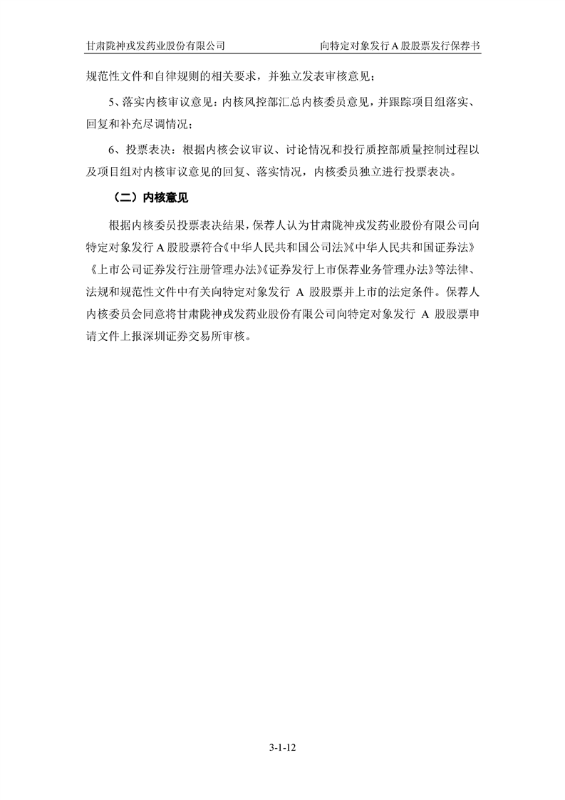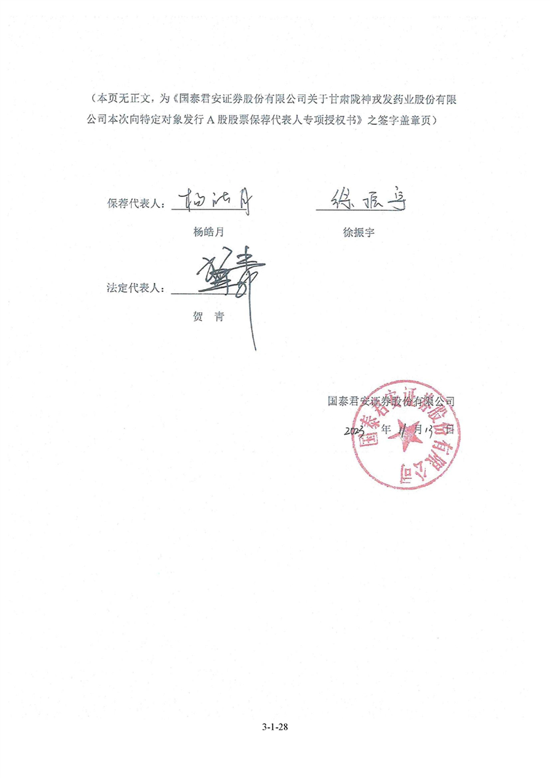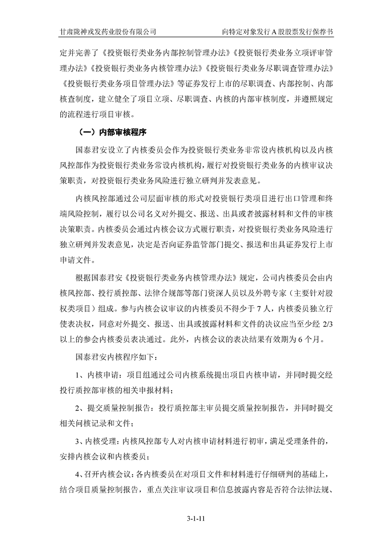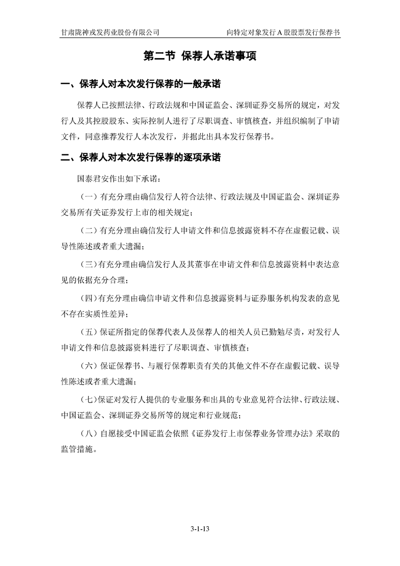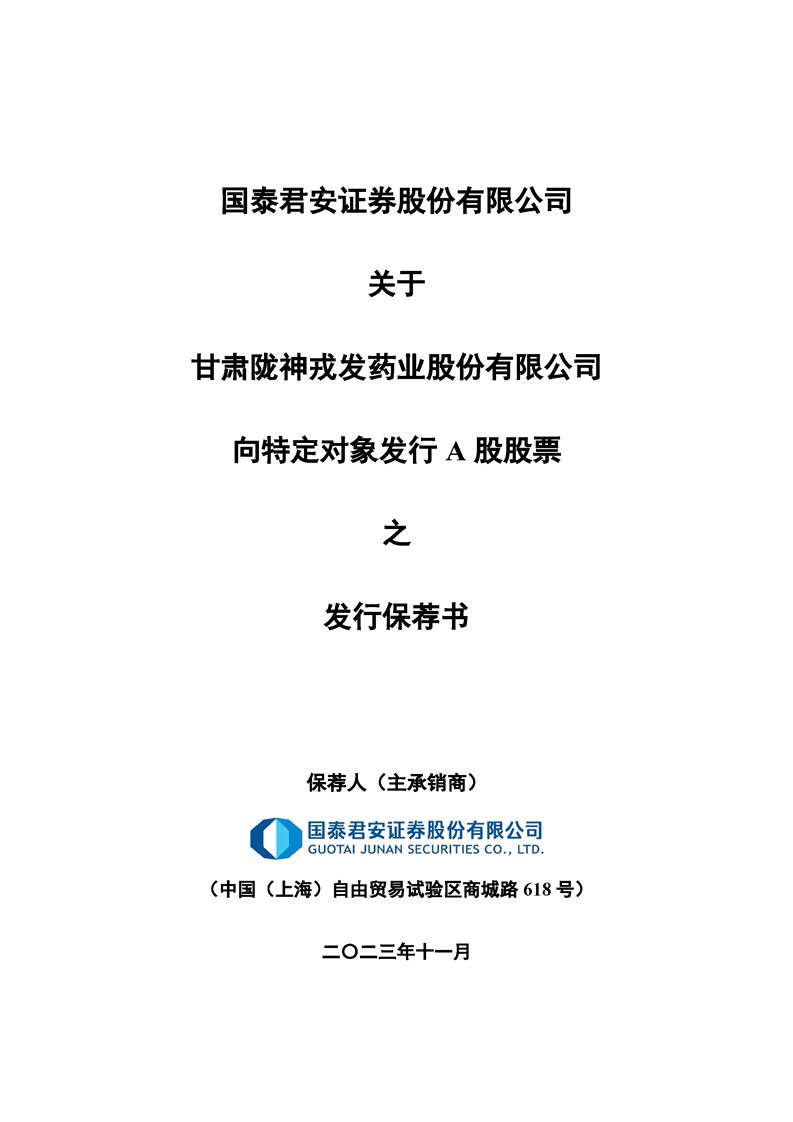 國(guó)泰君安證券股份有限公司關(guān)于甘肅隴神戎發(fā)藥業(yè)股份有限公司向特定對(duì)象發(fā)行A股股票之發(fā)行保薦書