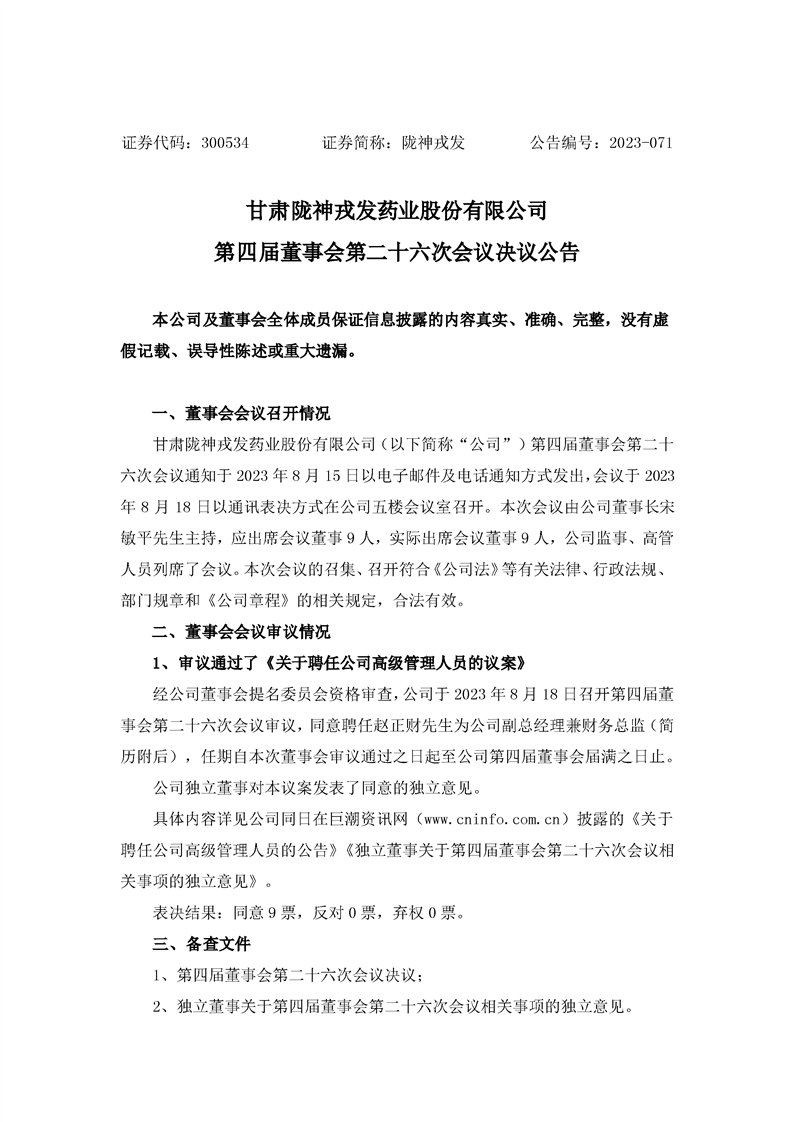 第四屆董事會第二十六次會議決議公告