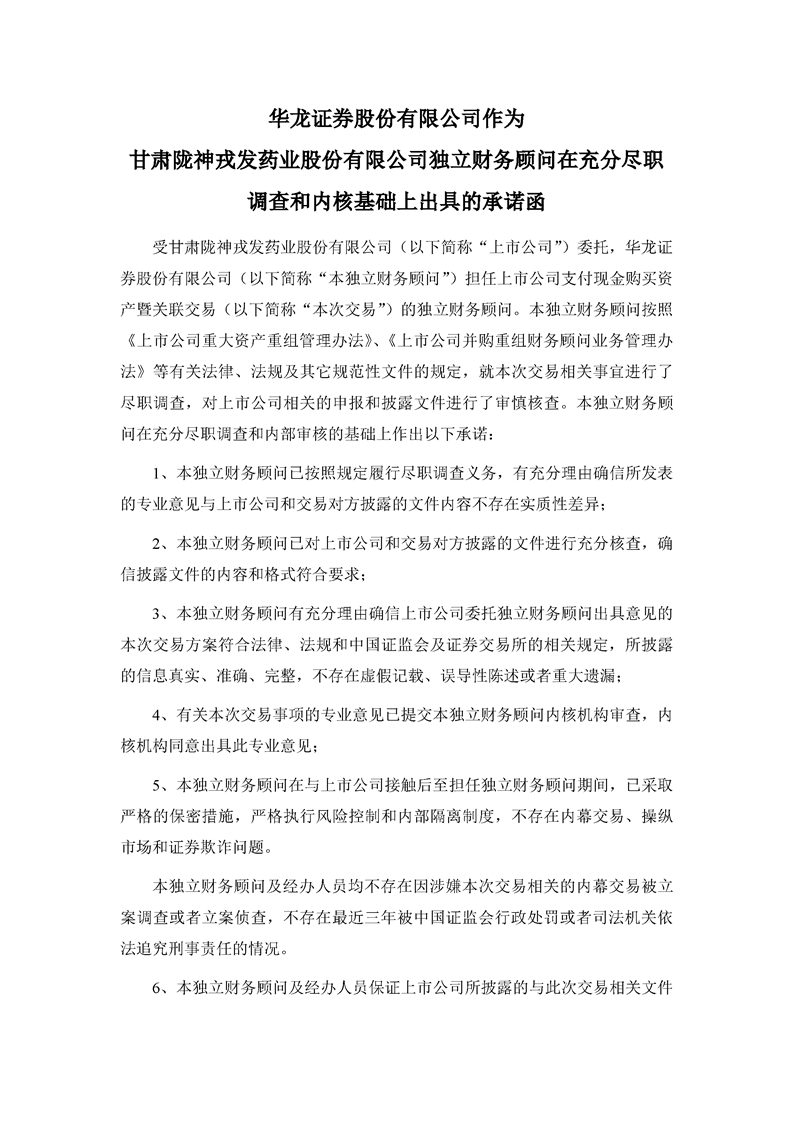 華龍證券股份有限公司作為甘肅隴神戎發(fā)藥業(yè)股份有限公司獨(dú)立財(cái)務(wù)顧問在充分盡職調(diào)查和內(nèi)核基礎(chǔ)上出具的承諾函
