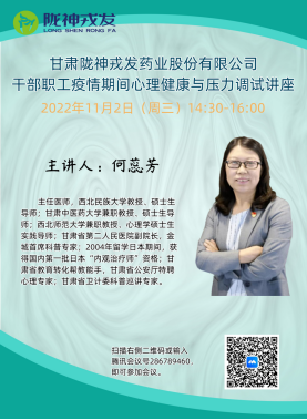 為有效緩解新冠肺炎疫情導(dǎo)致的負面影響,幫助公司干部職工積極預(yù)防和減輕疫情所造成的心理障礙及負面情緒,保障公司干部職工身心健康,11月2日下午,公司特邀甘肅省第二人民醫(yī)院副院長,西北民族大學(xué)教授、碩士生導(dǎo)師何蕊芳教授為公司干部職工開展“疫情期間心理健康與壓力調(diào)試”線上講座,公司近百名職工在線學(xué)習(xí)。