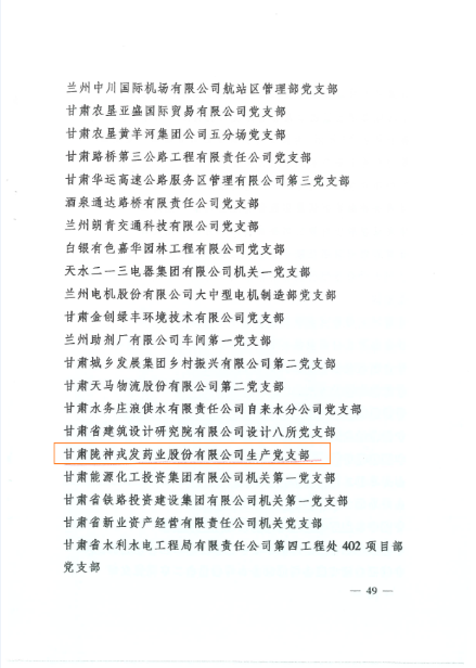 近日,甘肅省委組織部印發(fā)《關(guān)于命名1000個(gè)全省標(biāo)準(zhǔn)化先進(jìn)黨支部的通知》,對(duì)在決戰(zhàn)決勝脫貧攻堅(jiān)、統(tǒng)籌推進(jìn)疫情防控和經(jīng)濟(jì)社會(huì)發(fā)展、推動(dòng)脫貧攻堅(jiān)與鄉(xiāng)村振興有效銜接等重大任務(wù)、中心工作中涌現(xiàn)出的1000個(gè)標(biāo)準(zhǔn)化先進(jìn)黨支部進(jìn)行了命名。甘肅隴神戎發(fā)藥業(yè)股份有限公司所屬生產(chǎn)黨支部光榮上榜。