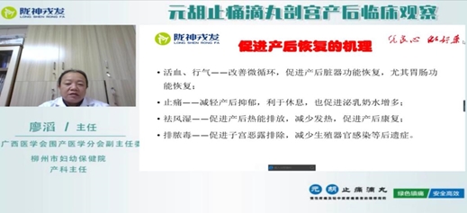 線上交流會第二場邀請到廣西醫(yī)學會圍產醫(yī)學分會副主任委員、柳州市婦幼保健院產科主任廖滔教授主講《元胡止痛滴丸剖宮產后臨床觀察》,廖滔主任從病理生理過程講解產后疼痛的特點、從病理生理進行藥物分析,從止痛的機理講解元胡止痛滴丸促進產后恢復的優(yōu)勢,最后從臨床實例分享元胡止痛滴丸使用的效果。