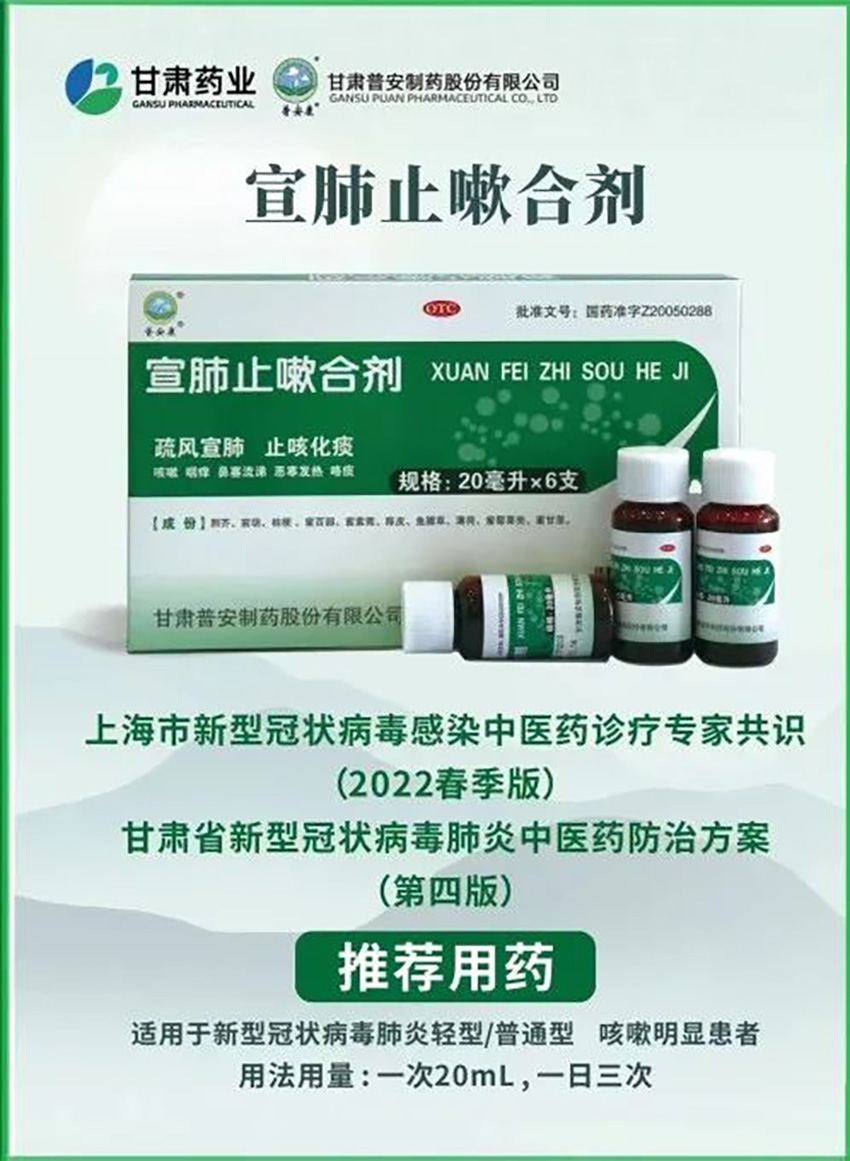 此次捐贈的宣肺止嗽合劑,為甘肅藥業(yè)集團旗下普安制藥股份有限公司生產(chǎn)的主打產(chǎn)品,先后被納入《上海市新型冠狀病毒感染中醫(yī)藥診療專家共識(2022春季版)》、《甘肅省新型冠狀病毒肺炎中醫(yī)藥防治方案(第四版)》推薦用藥,也被甘肅省援疆醫(yī)療隊和青海方艙醫(yī)院等作為重點選用的中成藥之一,適用于新型冠狀病毒肺炎輕型、普通型和咳嗽明顯患者。經(jīng)實效性研究顯示,宣肺止嗽合劑治療新冠肺炎咳嗽癥狀緩解率達98.3%,7天咳嗽癥狀消失率為72.4% 。