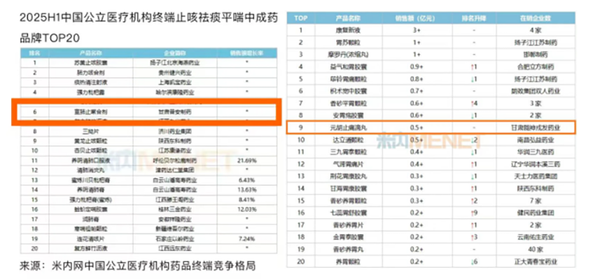 市場認(rèn)可度的持續(xù)提升成為企業(yè)發(fā)展的有力佐證。2024年公司成功入選“2023年度中國中藥企業(yè)TOP100排行榜”,位列第71位,躋身全國中藥企業(yè)第一梯隊(duì);核心產(chǎn)品宣肺止嗽合劑憑借過硬品質(zhì)與市場表現(xiàn),榮登“2024中國創(chuàng)新藥銷售企業(yè)排行榜(中藥)TOP20”第7位,同時(shí)躋身多項(xiàng)終端市場TOP20榜單;另一核心產(chǎn)品元胡止痛滴丸也在公立醫(yī)療機(jī)構(gòu)終端中成藥丸劑、胃藥等細(xì)分領(lǐng)域穩(wěn)居前列。截至2025年,核心產(chǎn)品累計(jì)覆蓋等級(jí)醫(yī)院主打產(chǎn)品元胡止痛滴丸和宣肺止嗽合劑等級(jí)醫(yī)院覆蓋分別達(dá)到2800余家、2000余家,兩大核心產(chǎn)品的市場占有率和核心競爭力穩(wěn)步提升,成為“隴藥”走向全國的標(biāo)桿產(chǎn)品。