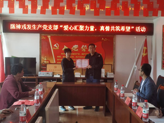 代表生產(chǎn)第一黨支部和生產(chǎn)第二黨支部為杜強(qiáng)愛人捐贈(zèng)善款