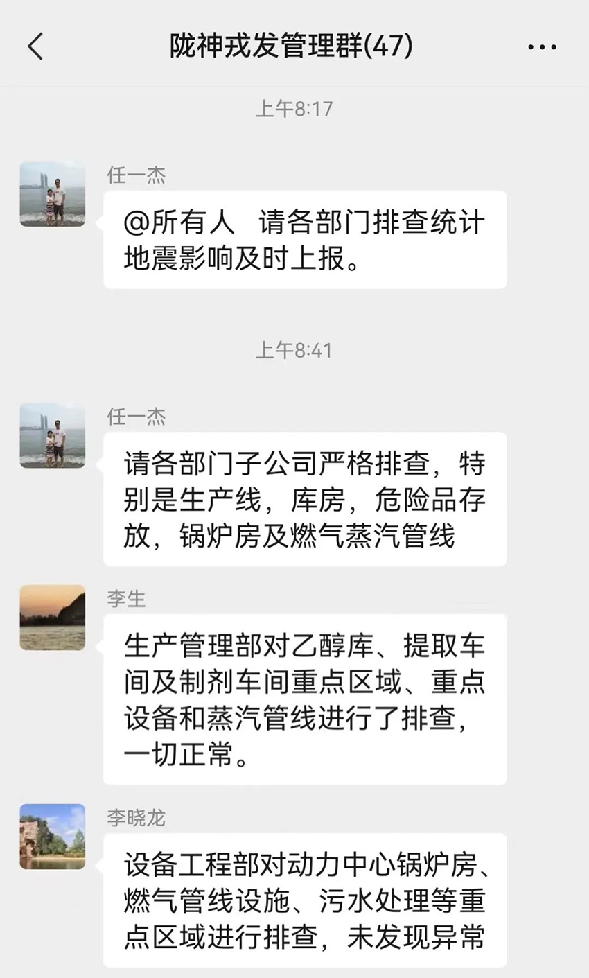 甘肅積石山縣地震發(fā)生后,隴神戎發(fā)認(rèn)真貫徹落實(shí)集團(tuán)公司部署要求,結(jié)合公司實(shí)際,積極開(kāi)展隱患自查排查工作。12月19日下午公司安委會(huì)邀請(qǐng)?zhí)m州高新區(qū)安監(jiān)局及專(zhuān)家一行5人,對(duì)公司質(zhì)檢辦公大樓、動(dòng)力中心、污水處理站、乙醇庫(kù)、前處理提取車(chē)間、固體制劑車(chē)間等各個(gè)單體的建筑結(jié)構(gòu)、外墻裂縫、廠區(qū)道路塌陷等情況進(jìn)行詳細(xì)檢查,經(jīng)檢查未發(fā)現(xiàn)因地震引起的安全隱患,公司運(yùn)營(yíng)一切正常。