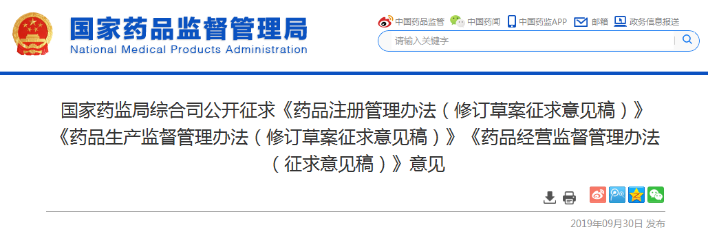 ![]() 《藥品注冊管理辦法(修訂草案征求意見稿)》電子郵箱:ypzcglbf@nmpa.gov.cn 《藥品生產(chǎn)監(jiān)督管理辦法(修訂草案征求意見稿)》《藥品經(jīng)營監(jiān)督管理辦法(征求意見稿)》電子郵箱:ypjgs@nmpa.gov.cn