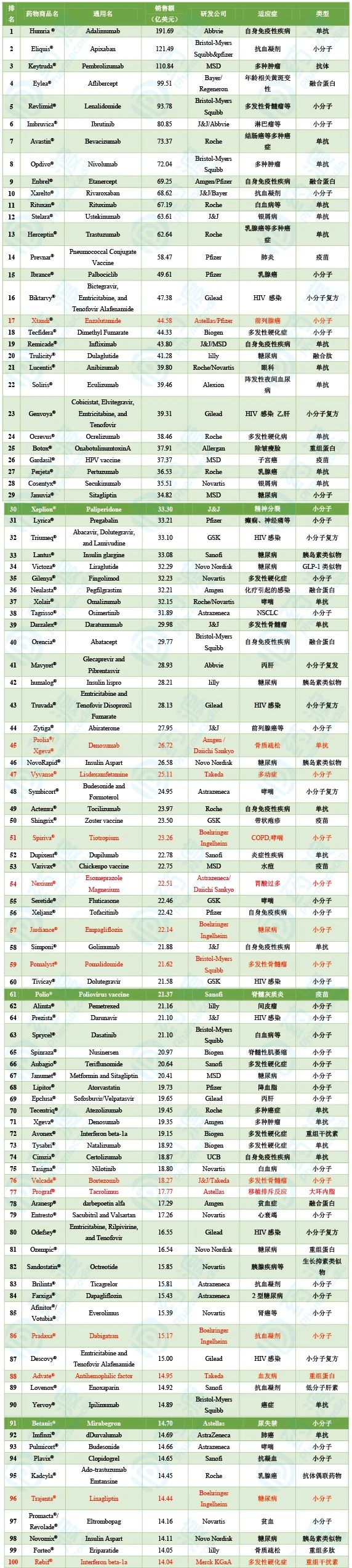 隨著世界各大醫(yī)藥公司陸續(xù)發(fā)布了2019年年報(bào),最新的全球藥物銷售額TOP100榜單也就出爐了。統(tǒng)計(jì)發(fā)現(xiàn),TOP100的門檻已經(jīng)超過了14億美元,比去年增長了超過10%,TOP100銷售總額達(dá)到了3370億美元,比去年增長了大約7%,反映出全球藥物市場的不斷快速增長。今年全球的“藥王”依然是艾伯維的抗TNFα單抗Humira®(修美樂®),這也是其連續(xù)8年蟬聯(lián)銷售冠軍。受歐洲等地區(qū)專利已經(jīng)到期的影響,它的銷售額比去年下降了 3.85%至191.69億美元,沖擊200億美元大關(guān)再次失敗,這應(yīng)該也是它最后的機(jī)會(huì),未來幾年它的銷售額將會(huì)不斷下滑,但還不至于斷崖式的跌落,因?yàn)樵谒闹饕袌雒绹?,艾伯維進(jìn)行了一系列的專利保護(hù)措施,贏得了幾乎所有的專利訴訟,使得它未來幾年還能受專利保護(hù)。