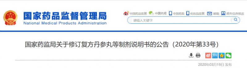 3月19日,國(guó)家藥品監(jiān)督管理局對(duì)復(fù)方丹參丸,包括復(fù)方丹參丸、復(fù)方丹參片、復(fù)方丹參膠囊、復(fù)方丹參軟膠囊、復(fù)方丹參腸溶膠囊、復(fù)方丹參噴霧劑(復(fù)方丹參氣霧劑)、復(fù)方丹參顆粒、復(fù)方丹參滴丸、復(fù)方丹參口服液等制劑,冠心蘇合丸等制劑11個(gè)品種說(shuō)明書(shū)進(jìn)行統(tǒng)一修訂。