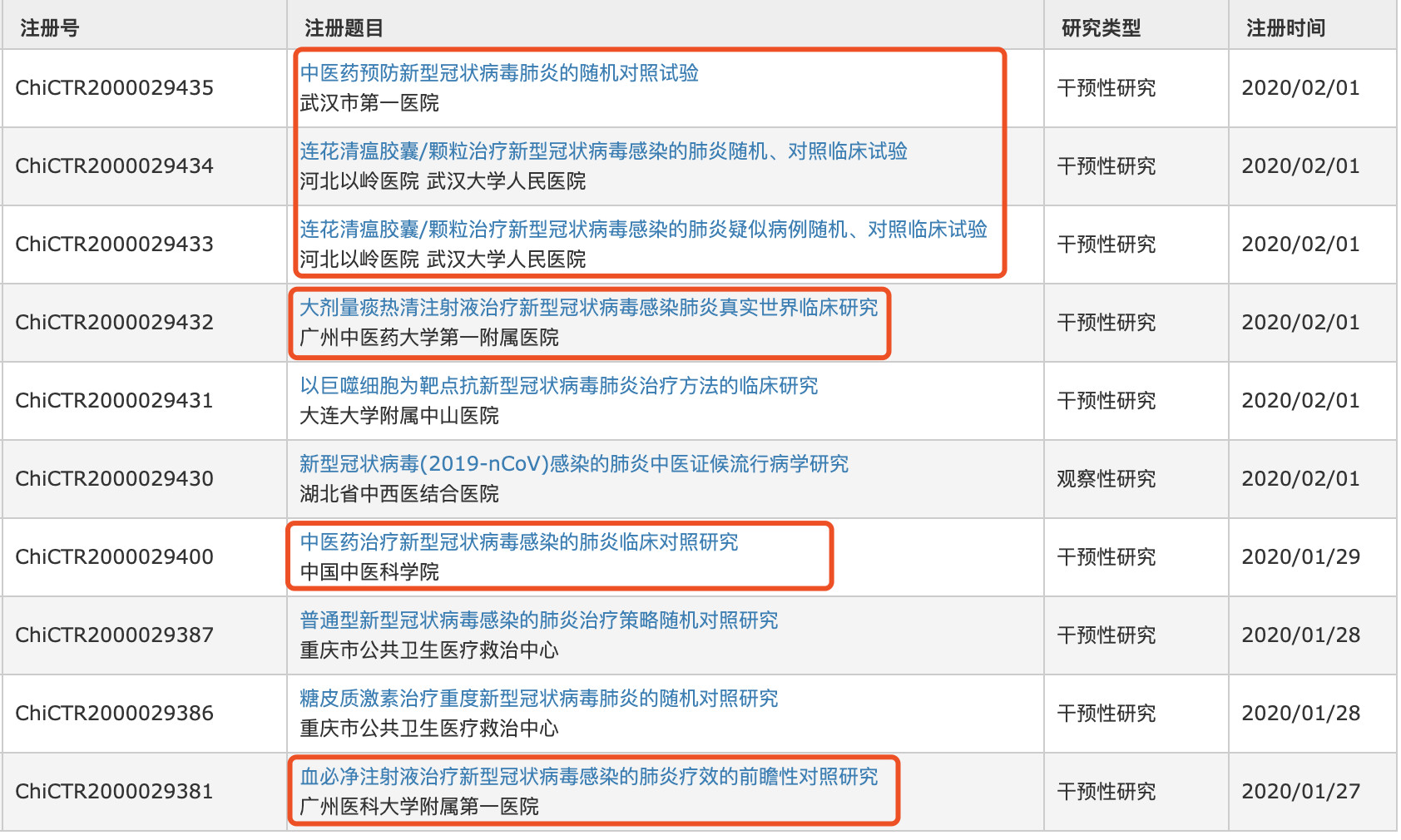 通過查詢中國臨床試驗注冊中心,涉及新型冠狀病毒肺炎的臨床研究有40項,其中涉及到中醫(yī)藥的項目有:中西藥結(jié)合治療、中醫(yī)藥防治、肺康復(fù)、蓮花清瘟膠囊/顆粒、痰熱清注射液、血必凈注射、熱毒寧注射液等18項,占總數(shù)的45%。