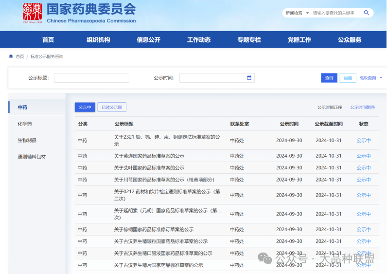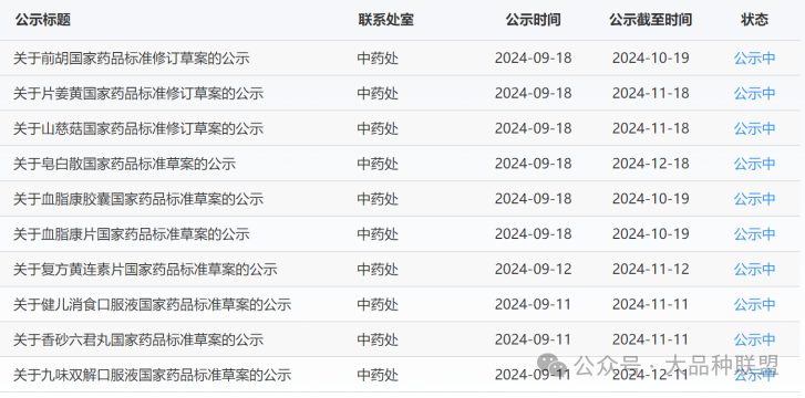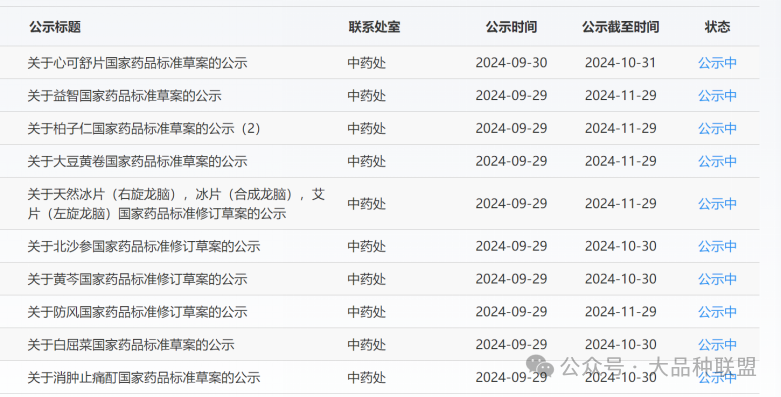 2024年9月29-30日,國家藥典委公示了19個中藥標(biāo)準(zhǔn)草案:黃連、艾葉、川芎、延胡索(元胡)、棕櫚、益智、柏子仁、大豆黃卷、北沙參、黃芩、防風(fēng)、白屈菜、天然冰片(右旋龍腦),冰片(合成龍腦),艾片(左旋龍腦);古漢養(yǎng)生精顆粒、古漢養(yǎng)生精口服液、古漢養(yǎng)生精片、心可舒片、消腫止痛酊。