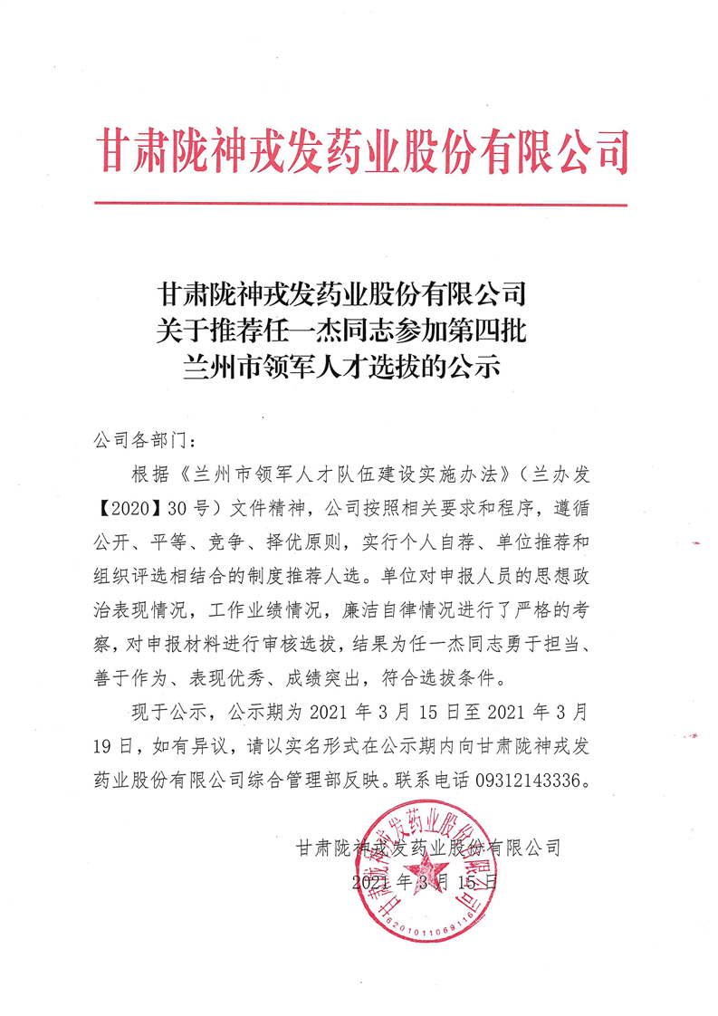 關(guān)于推薦任一杰同志參加第四批蘭州市領(lǐng)軍人才選拔的公示