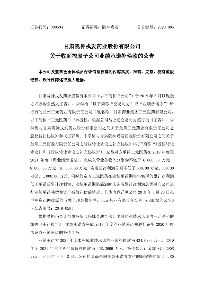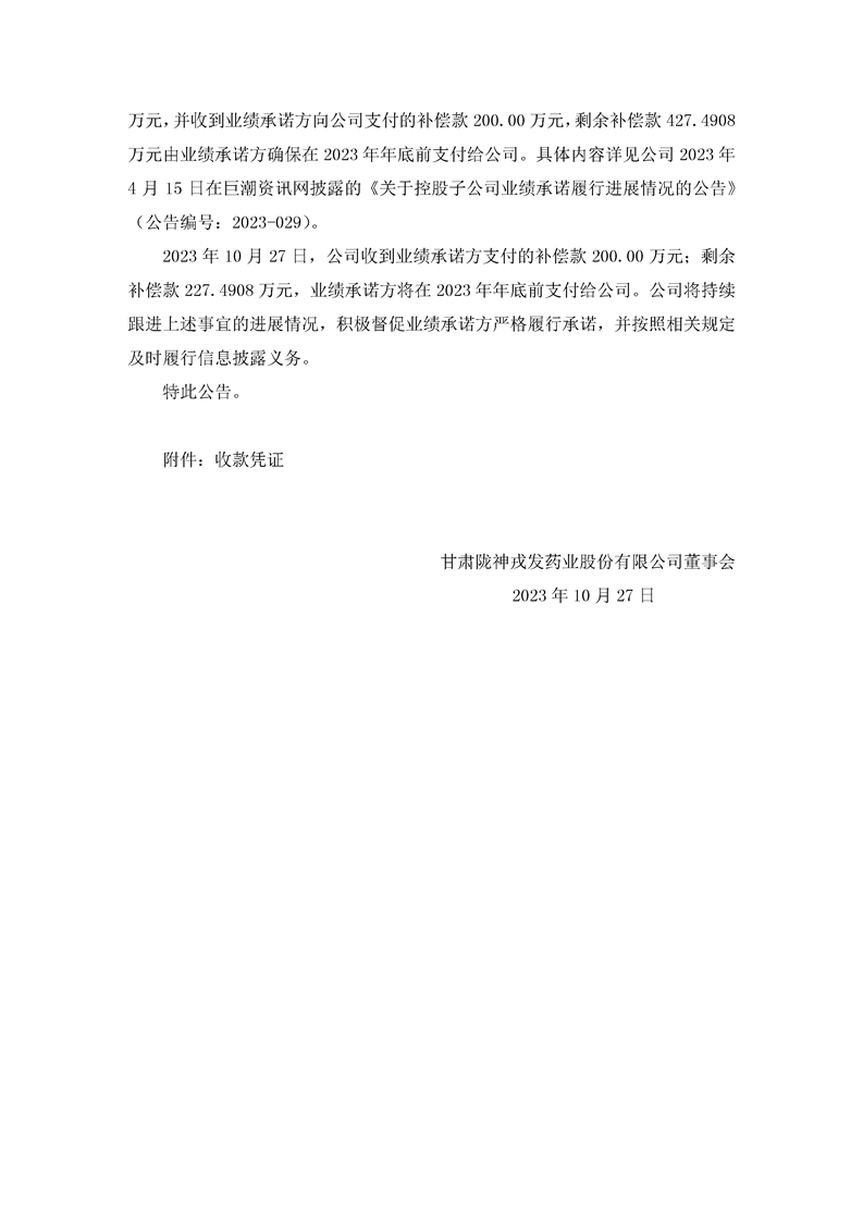 關(guān)于收到控股子公司業(yè)績(jī)承諾補(bǔ)償款的公告